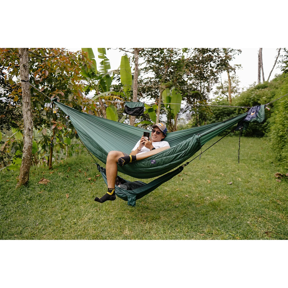 Hamak z kieszenią na dole do umieszczenia materaca. Zapewnia większy komfort podczas leżenia, a także doskonałą izolację od zimna z ziemi. Nadaje się do większości materacy o wymiarach do 70x200 cm.