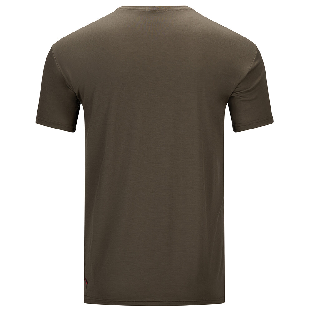 Męska koszulka premium merino Woodworker Tee norweskiej firmy Devold z grafiką na plecach. Wygodna i komfortowa, niezależnie od tego, czy nosisz ją do jogi, jazdy na rolkach, pracy czy podróży.