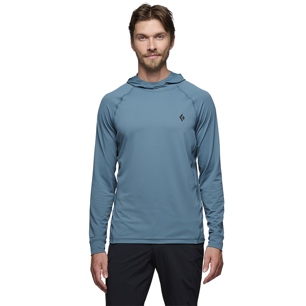 Męska koszulka LS Alpenglow Hoody amerykańskiej firmy Black Diamond olśni Cię funkcjonalnymi detalami.