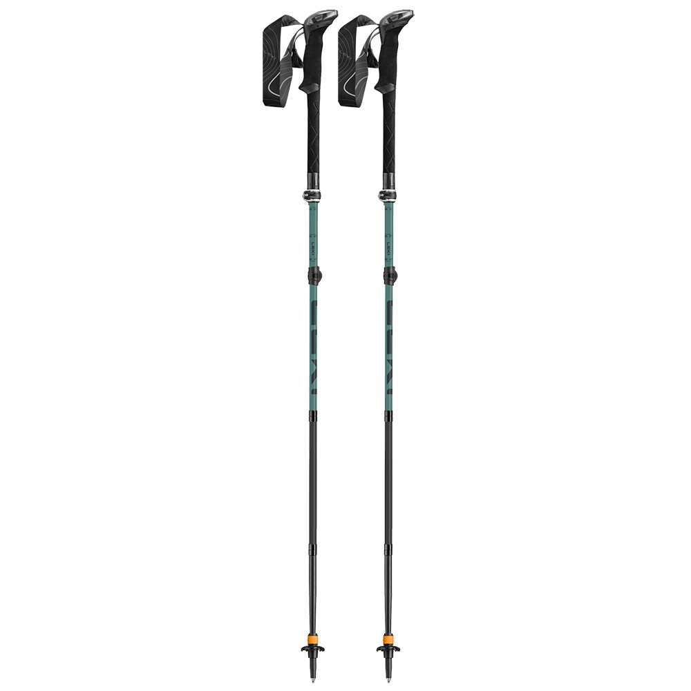 Lekkie kije turystyczne wykonane z włókna węglowego. Są składane, z możliwością regulacji konkretnej długości. Posiadają przedłużony uchwyt wykonany z pianki EVA, regulowany pasek na nadgarstek i gumowe buty.