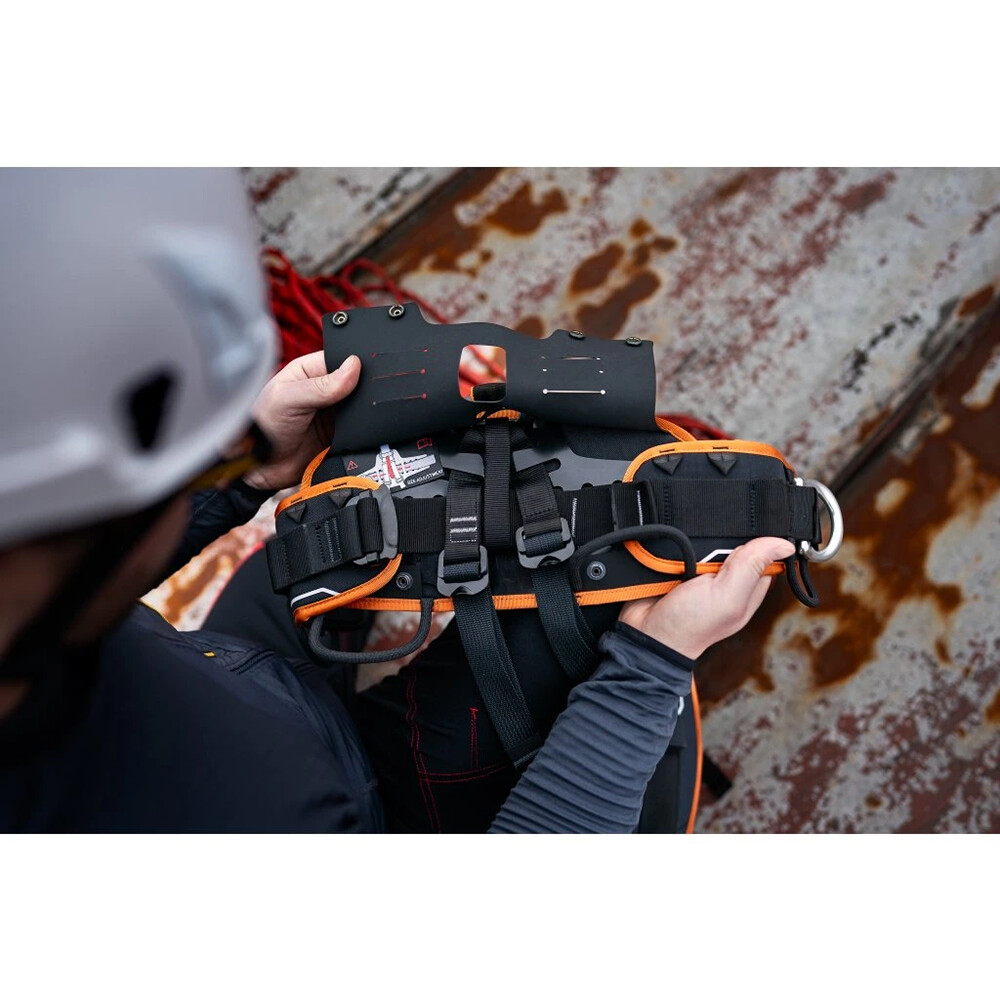 Szeroką wszechstronność zapewnia również zmienny system szczelin (w połączeniu z rzepem) na poduszce oparcia. Szczeliny w poduszce naramiennej służą do przechowywania mniejszych przedmiotów (np. noża itp.). W zestawie znajduje się również sześć klasycznych pętli materiałowych i pętla do holowania. Siedzisko można regulować za pomocą aluminiowych klamer szybkiego zwalniania. Luźne końce pasków można zabezpieczyć za pomocą systemu SB. Punkty mocowania są wykonane z aluminium, z wyjątkiem tylnego punktu zabezpieczającego przed upadkiem, który jest rzadko używany. Jest on przechowywany w kieszeni pokrowca i wyciągany tylko wtedy, gdy jest potrzebny. Jest tekstylny dla zmniejszenia wagi. Oczywiście są też elementy odblaskowe dla bezpieczeństwa.