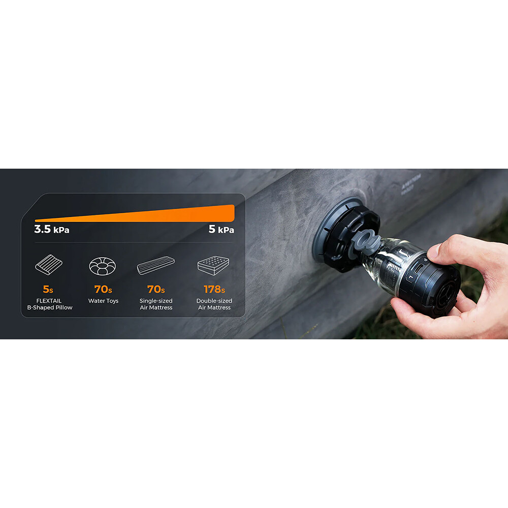 Pompka MAX Pump 3 firmy Flextail ma niewielkie rozmiary, ale dużą wydajność, z wysokim ciśnieniem do 5 kPa i prędkością pompowania do 500 l/min. Idealna do pompowania nie tylko przyczep kempingowych, ale także łodzi. Ponadto posiada funkcję latarki.