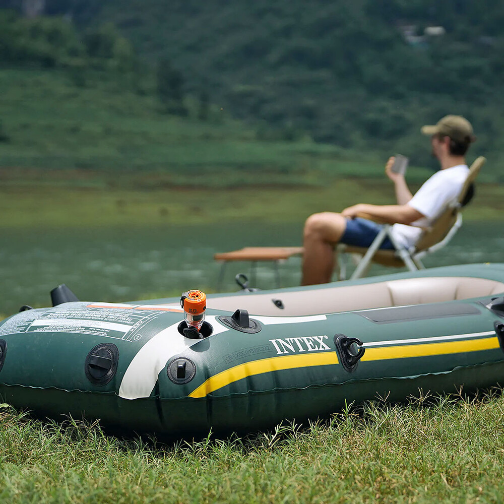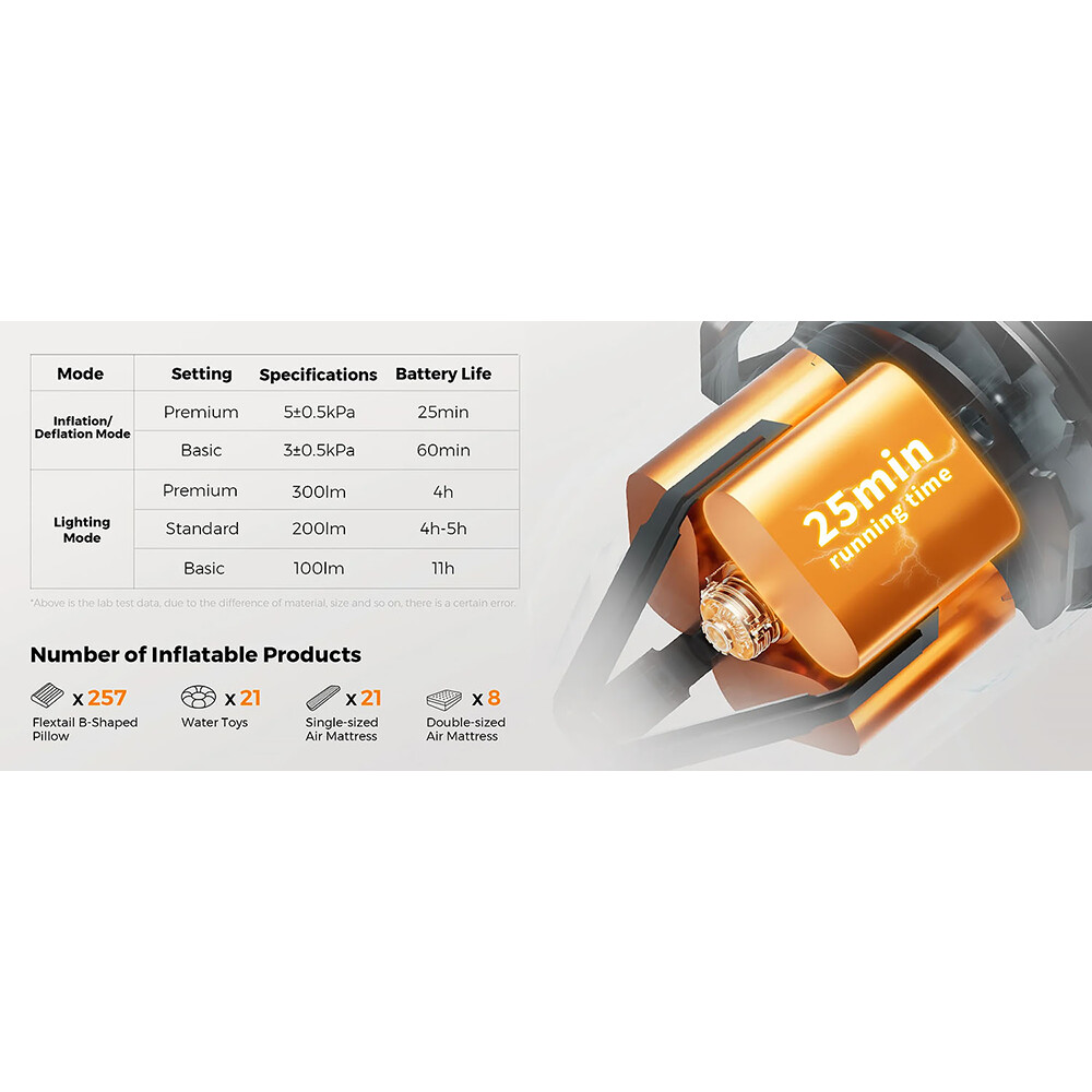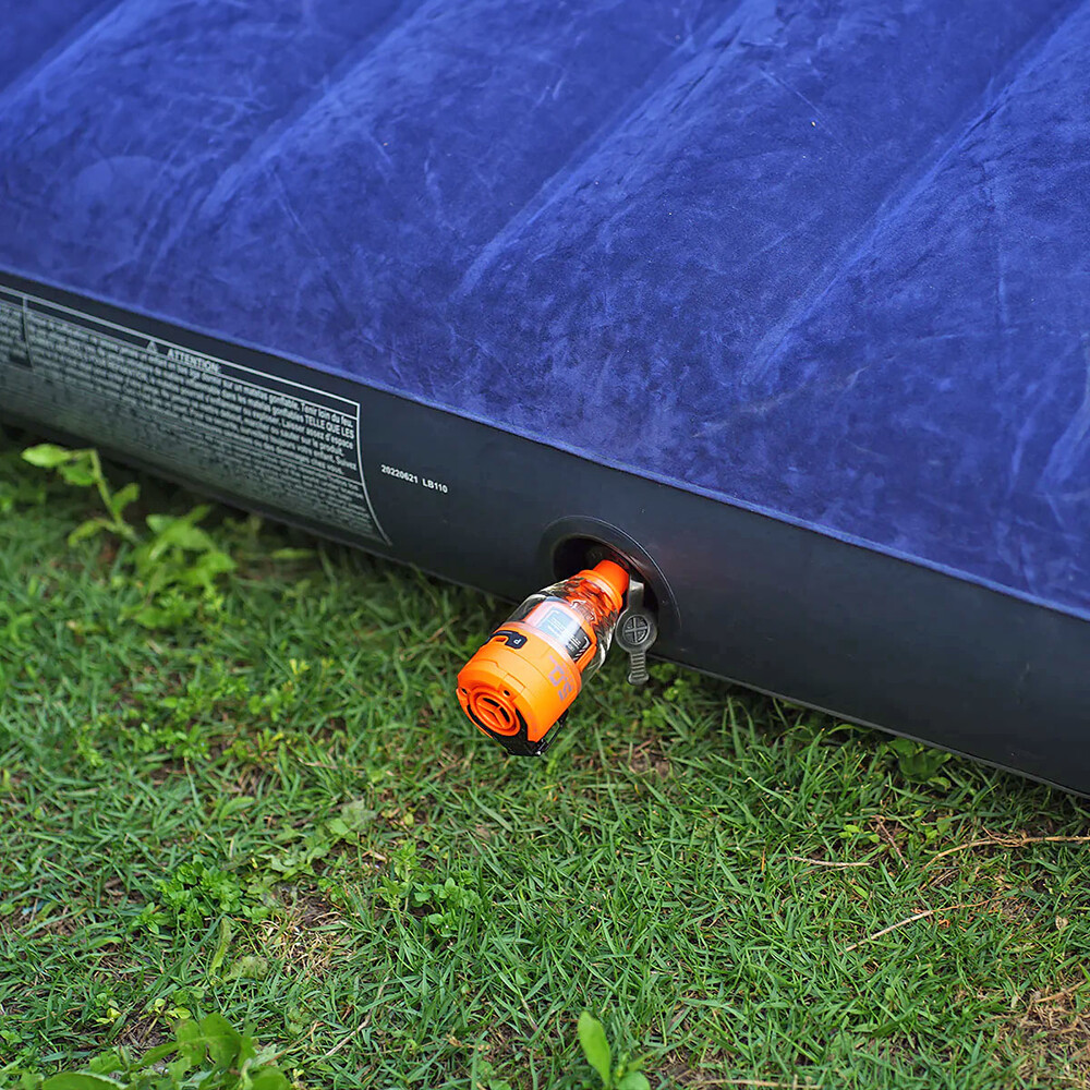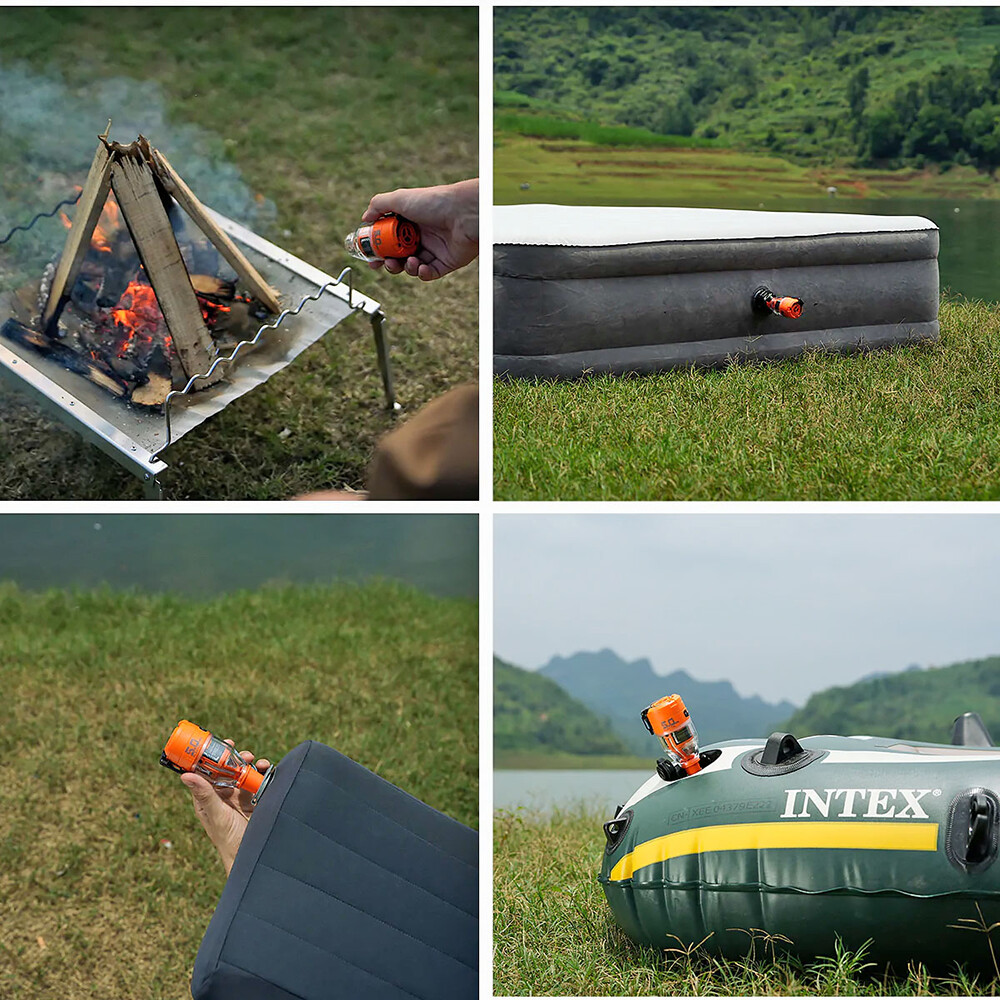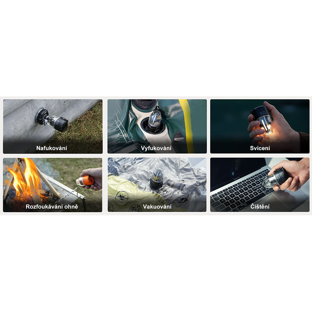 Kieszonkowa ładowalna pompka powietrza, która działa również jako pompa próżniowa, latarka i power bank. Można jej użyć do nadmuchania materaca, poduszki podróżnej, mniejszej łodzi lub pływającego pierścienia.