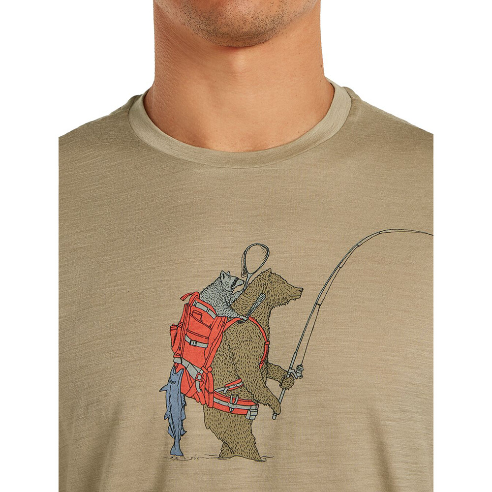 Stuprocentowa wełna merynosów jest lekka, oddychająca i naturalnie odporna na zapachy, zachowując jednocześnie komfort termiczny w chłodne i ciepłe dni. Przesunięte szwy na ramionach zmniejszają tarcie podczas noszenia plecaka i zwiększają komfort podczas całodziennych aktywności. Okrągły dekolt i krótki rękaw idealnie dopasowują się do sylwetki. Pomysłowy nadruk niedźwiedzia wędkarskiego sprawi, że Twój dzień będzie przyjemniejszy.