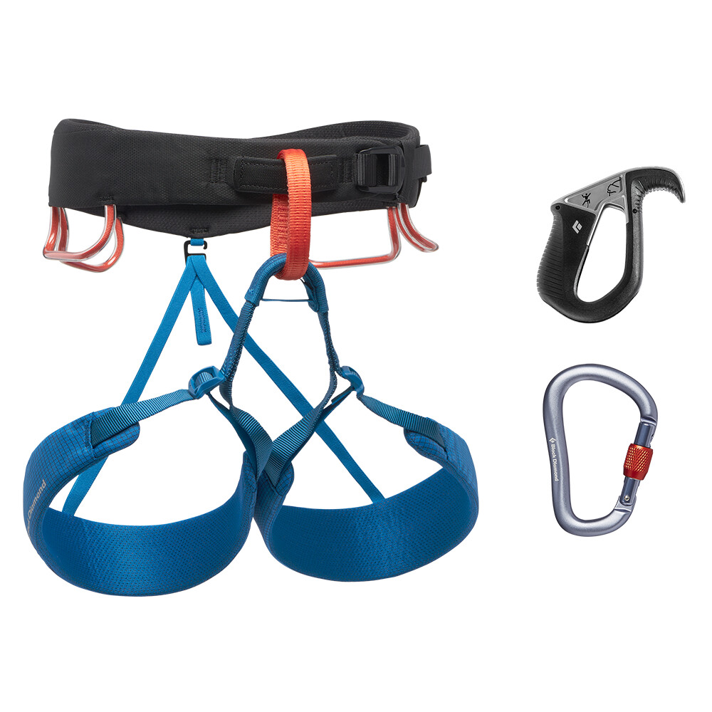 Zestaw startowy do wspinaczki na ściance lub treningu w skałach. W skład zestawu wchodzi bardzo popularne i wygodne siedzisko Black Diamond Momentum.
