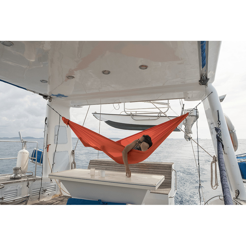 Ultralekki hamak ważący zaledwie 220g. Mimo to zachowuje wszystkie standardowe parametry, w tym udźwig do 150 kg. Idealny w podróży, gdzie liczy się każdy gram w bagażu. Karabinki w zestawie.