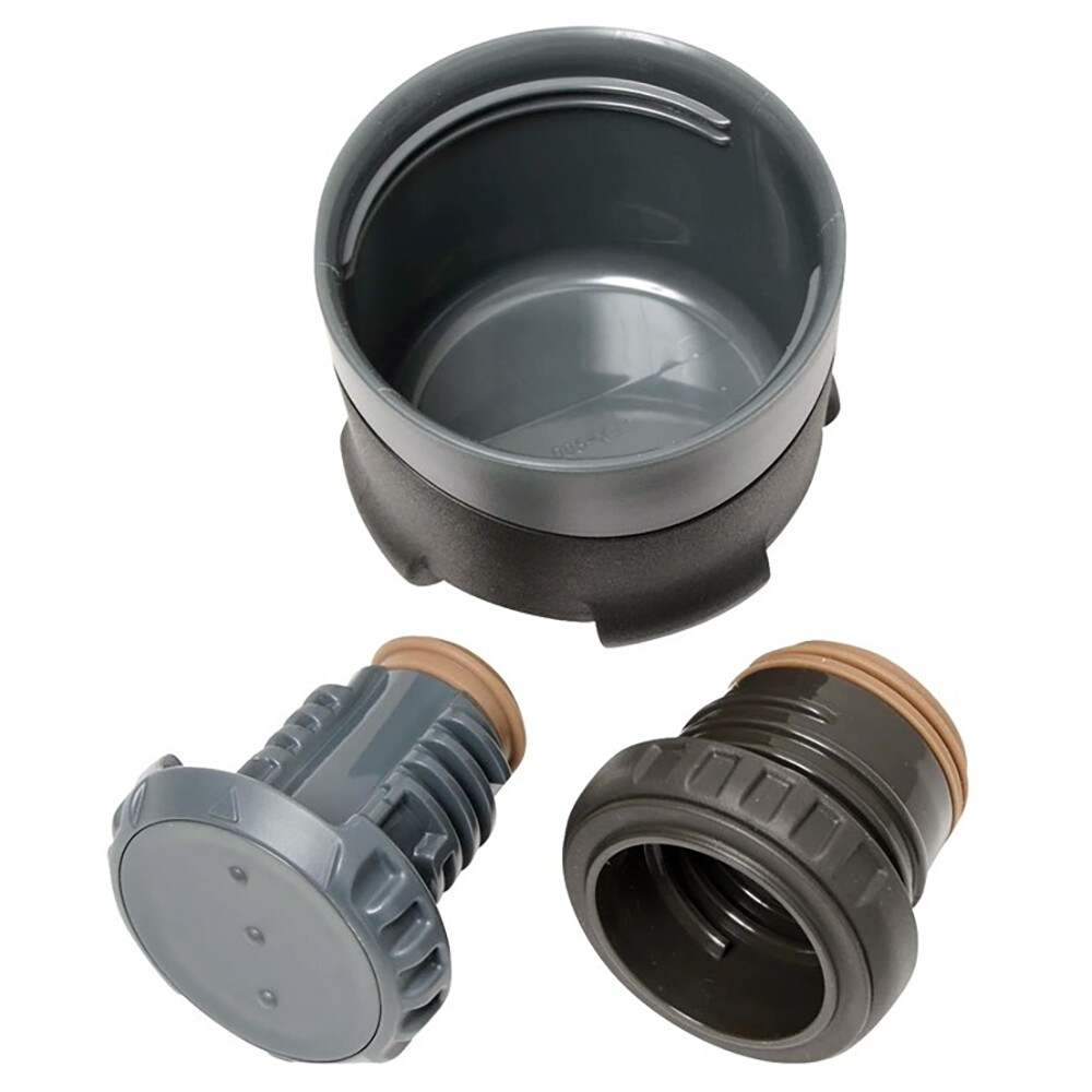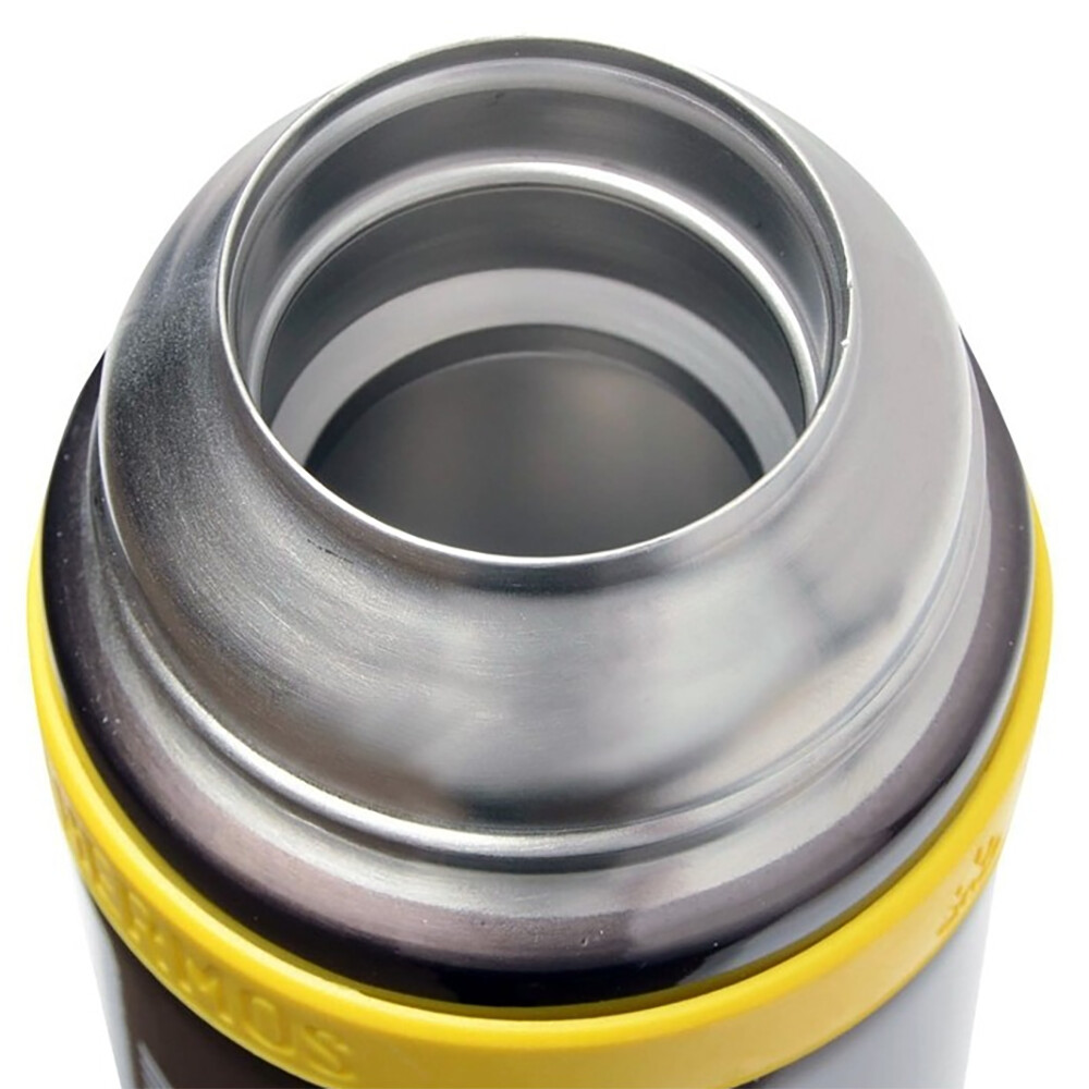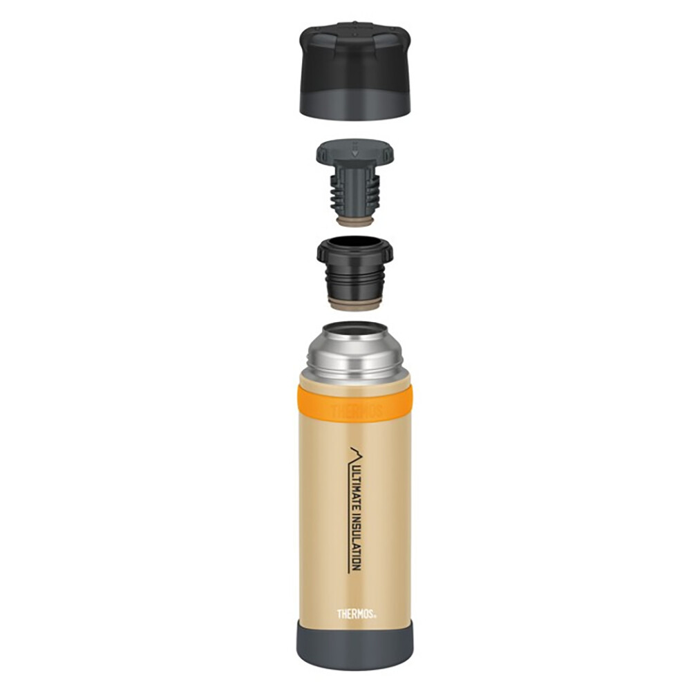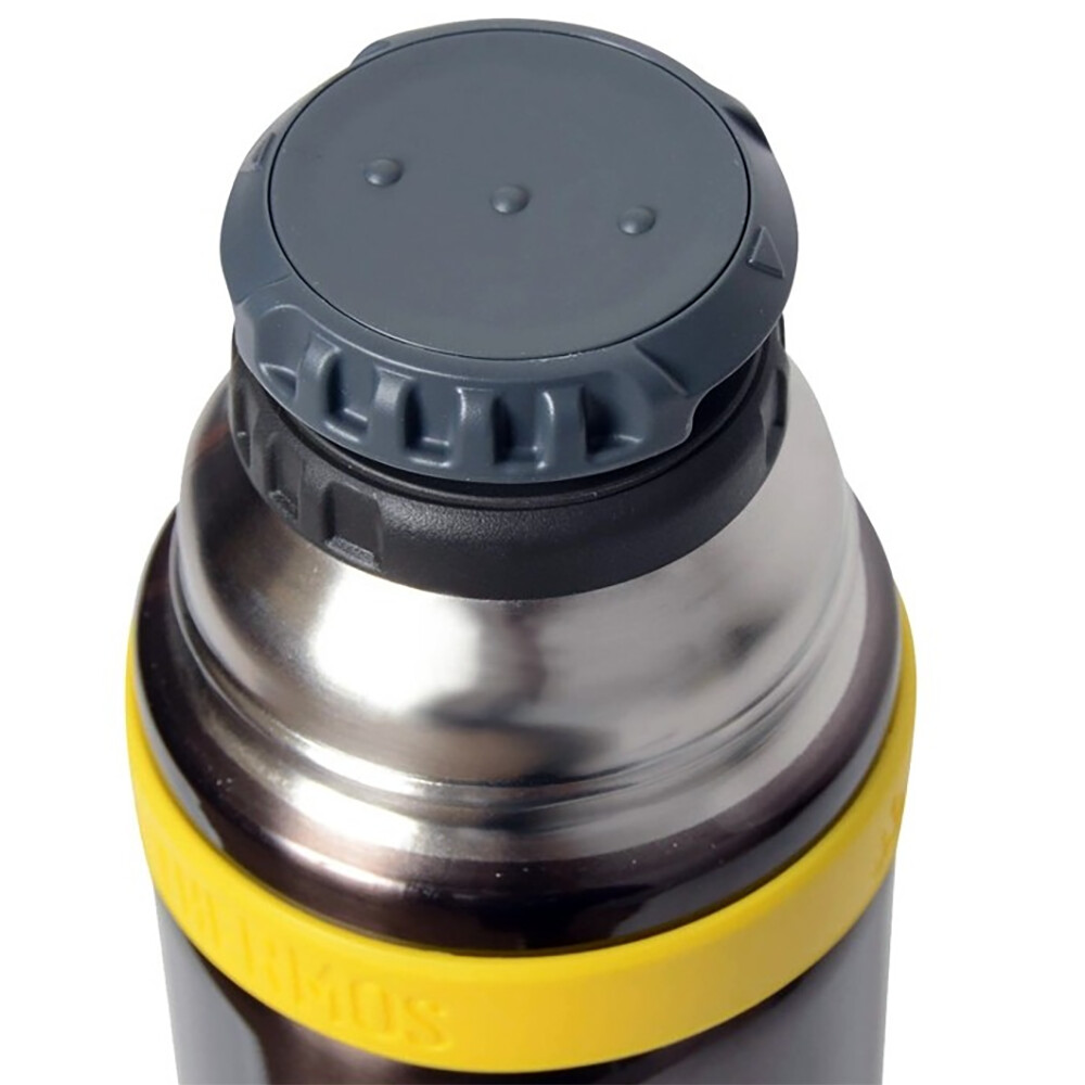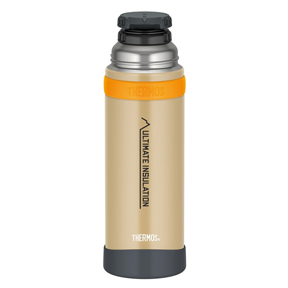 Dwuścienny termos Mountain firmy Thermos jest wykonany z wysokiej jakości stali nierdzewnej, a mimo to jest lekki, porównywalny z termosami wykonanymi z tytanu. Gumowy rękaw na spodzie i antypoślizgowy pierścień pod zakrętką zapewniają bezpieczną obsługę nawet w grubych rękawicach, a także chronią termos w przypadku upadku na ziemię. Podwójną zakrętkę wystarczy poluzować o pół obrotu i można płynnie nalewać. Termos utrzymuje temperaturę gorących napojów przez 30 godzin, a zimnych do 32 godzin.