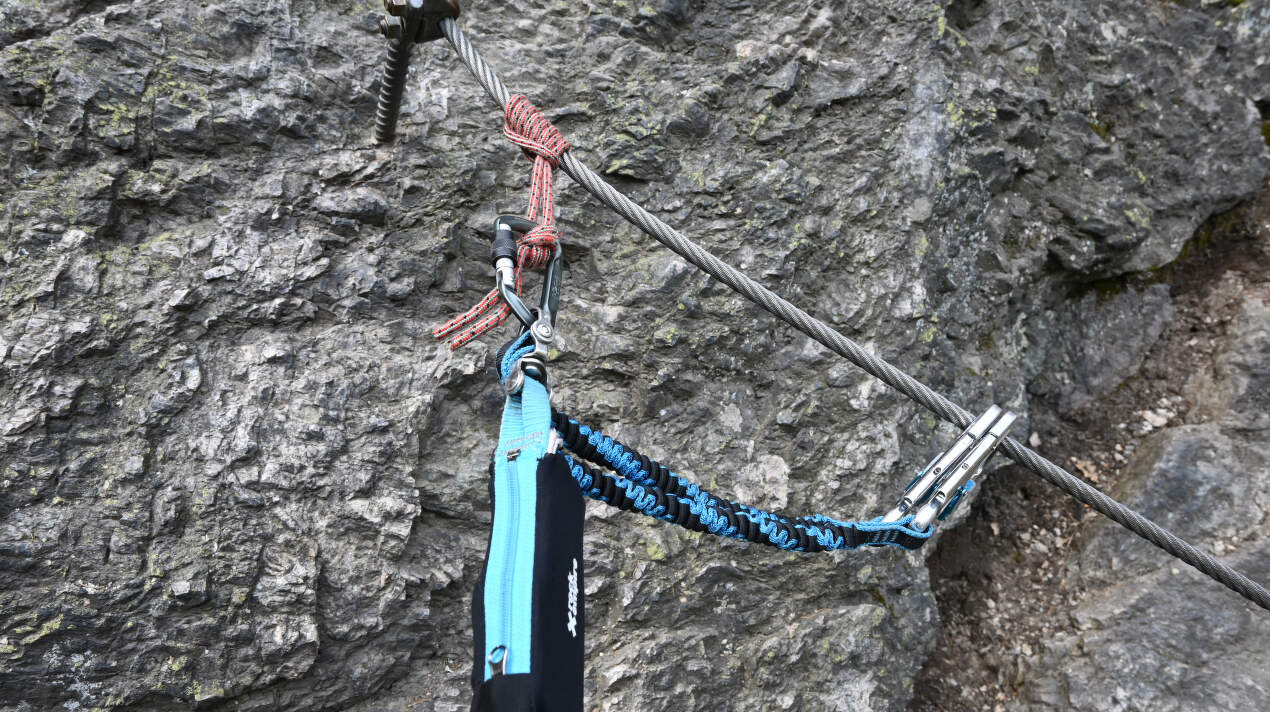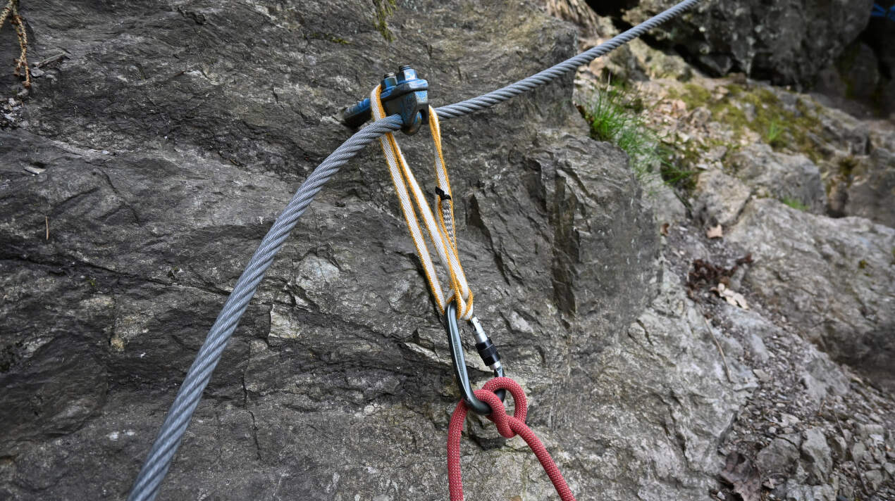 - Na odcinkach prostopadłych należy poruszać się jako pierwszy wspinacz na ferracie, zabezpieczony certyfikowanym amortyzatorem upadku. W razie potrzeby przypnij linę asekuracyjną do karabinka lub ekspresa w miejscu zmiany kierunku. W międzyczasie dziecko czeka zabezpieczone amortyzatorem w punkcie asekuracyjnym i w razie potrzeby pomaga podawać linę.
