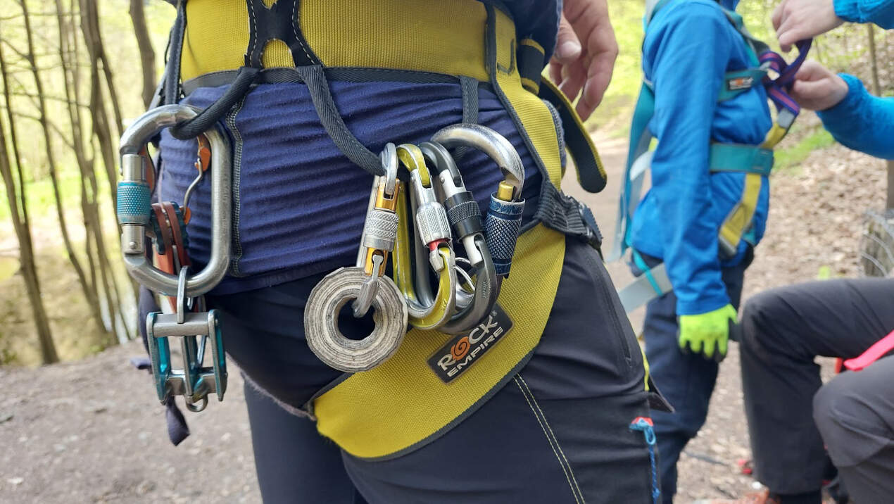 Oprócz kasku wspinaczkowego, uprzęży, amortyzatora upadku, rękawiczek i odpowiedniego obuwia, rodzic lub dorosły opiekun powinien mieć: