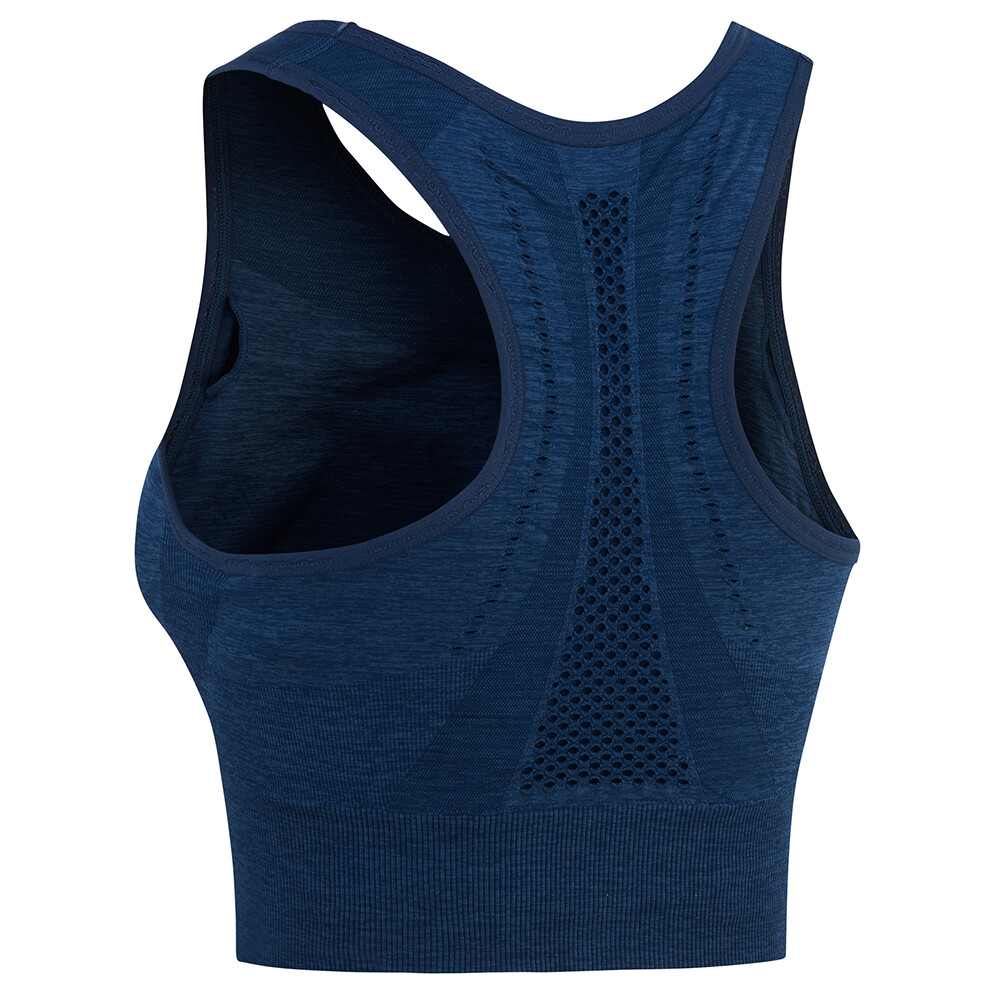 Biustonosz jest wykonany z elastycznego i szybkoschnącego materiału. Sportowy krój z wycięciem na plecach idealnie dopasowuje się do sylwetki. Bezszwowa konstrukcja zapewnia przyjemny komfort noszenia. Miseczki są wyjmowane. Strefowa konstrukcja zapewnia doskonałe odprowadzanie wilgoci.