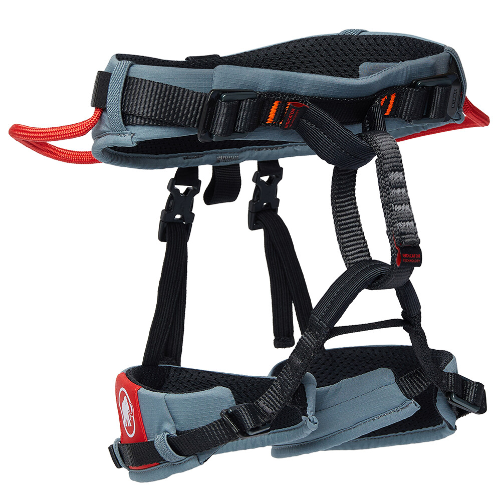 Uprząż na całe ciało dla najmłodszych z szerokimi pasami, wyściełanymi nogami i plecami zapewni dziecku najwyższy komfort podczas wspinaczki. Przednie ucho mocujące jest oznaczone kolorami.