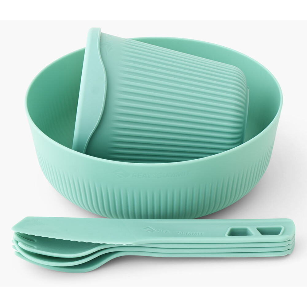 Podróżny zestaw obiadowy Sea To Summit wykonany z trwałego i bezpiecznego dla zdrowia polipropylenu. Jest odpowiedni dla jednej osoby i zawiera miskę (720 ml), kubek z pokrywką (355 ml) oraz komplet sztućców (łyżka, widelec, nóż). Poszczególne elementy można łączyć, tworząc rozszerzoną i odwracalną wersję, która jest idealna na przykład do jedzenia odwodnionej żywności prosto z pojemnika. Zewnętrzna żebrowana powierzchnia naczynia lepiej absorbuje temperaturę żywności i nie musisz się martwić o poparzenie rąk.