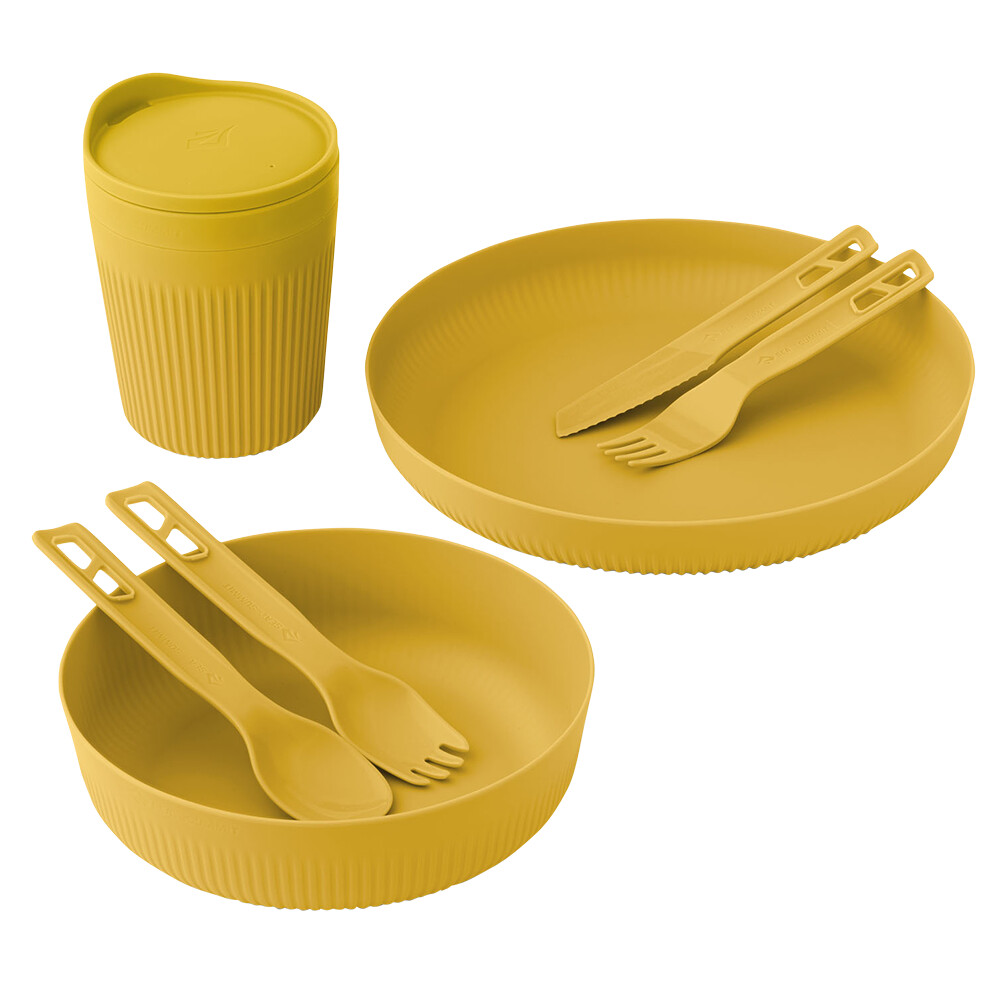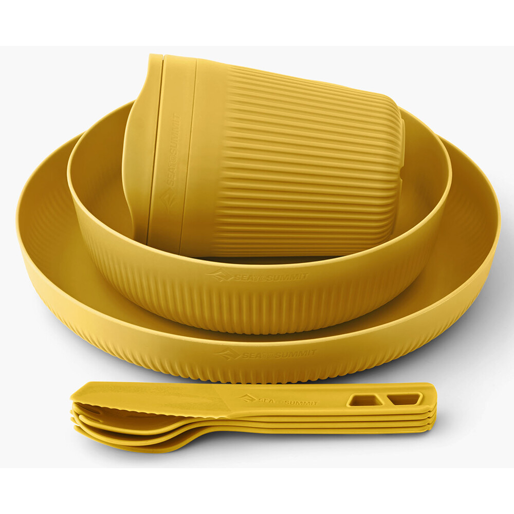 Podróżny zestaw obiadowy Sea To Summit wykonany z trwałego i bezpiecznego dla zdrowia polipropylenu. Jest odpowiedni dla jednej osoby i zawiera dużą miskę (945 ml), termos z pokrywką (475 ml), talerz i komplet sztućców (łyżka, widelec, nóż). Poszczególne elementy można łączyć ze sobą, tworząc rozszerzoną i odwracalną wersję, która jest idealna na przykład do jedzenia odwodnionej żywności prosto z pojemnika. Zewnętrzna żebrowana powierzchnia naczynia lepiej absorbuje temperaturę żywności i nie musisz się martwić o poparzenie rąk.