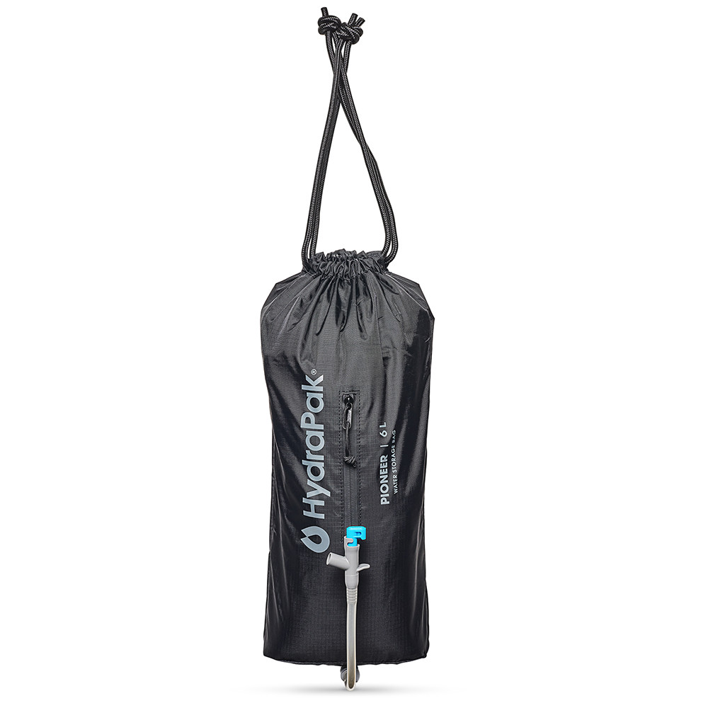 Worek na wodę Pioneer 6 firmy Hydrapak można wykorzystać podczas biwakowania lub wielodniowej wędrówki. Zawiera wytrzymałą nylonową pokrywę z kieszenią do przechowywania filtra wody lub innych akcesoriów. Dzięki pokrowcowi można zawiesić całą torbę i ułatwić dozowanie wody. W zestawie znajduje się również króciec dozujący do szybkiego napełniania butelek, mycia rąk lub naczyń pod "bieżącą" wodą.