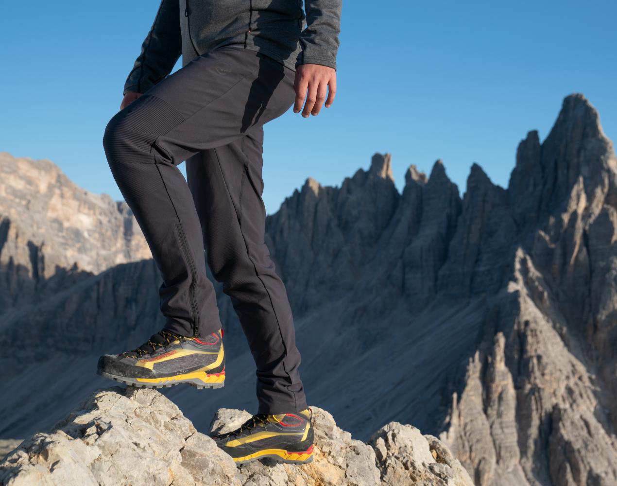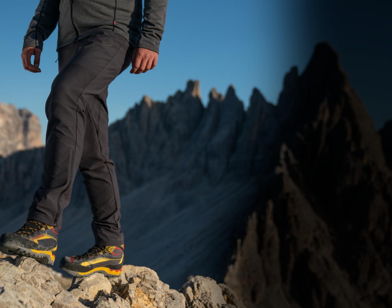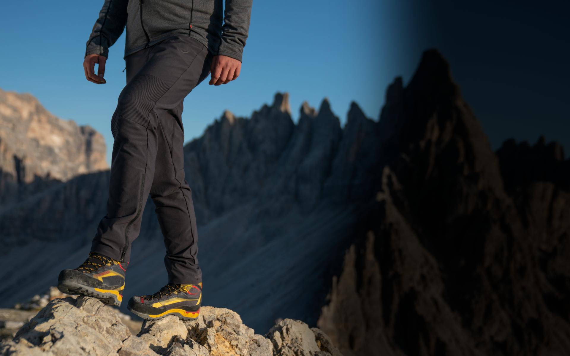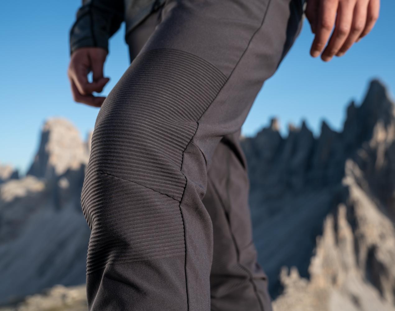 Techniczne spodnie softshellowe wykonane z wytrzymałego materiału stretchowego spełniają najwyższe wymagania alpinistów i alpinistek.