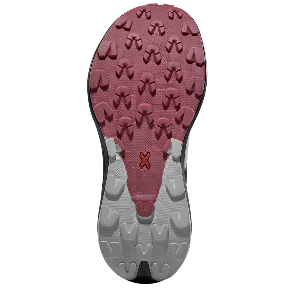 Sercem buta jest innowacyjna podeszwa środkowa XFlow™ Endurance, która łączy w sobie wysoki poziom amortyzacji, trwałości i stabilności. Zwiększona amortyzacja (37 mm pięta / 31 mm palce) chroni stopy przed zmęczeniem i uderzeniami, nawet podczas biegania po twardych nawierzchniach lub skalistym terenie. Stabilna platforma (ok. 85 mm pięta / 110 mm palce) gwarantuje pewny krok nawet na technicznym terenie. Podeszwa zewnętrzna FriXion® Red łączy w sobie lepką gumę w przedniej części stopy dla pewności na technicznych przejściach i bardziej wytrzymałą mieszankę w pięcie dla trwałości. 4-milimetrowe bloki zapewniają wystarczającą przyczepność na luźnym podłożu, zachowując jednocześnie wygodę na trudniejszych szlakach. To połączenie sprawia, że Prodigio Max nadaje się zarówno w góry, jak i na leśne i szutrowe drogi.