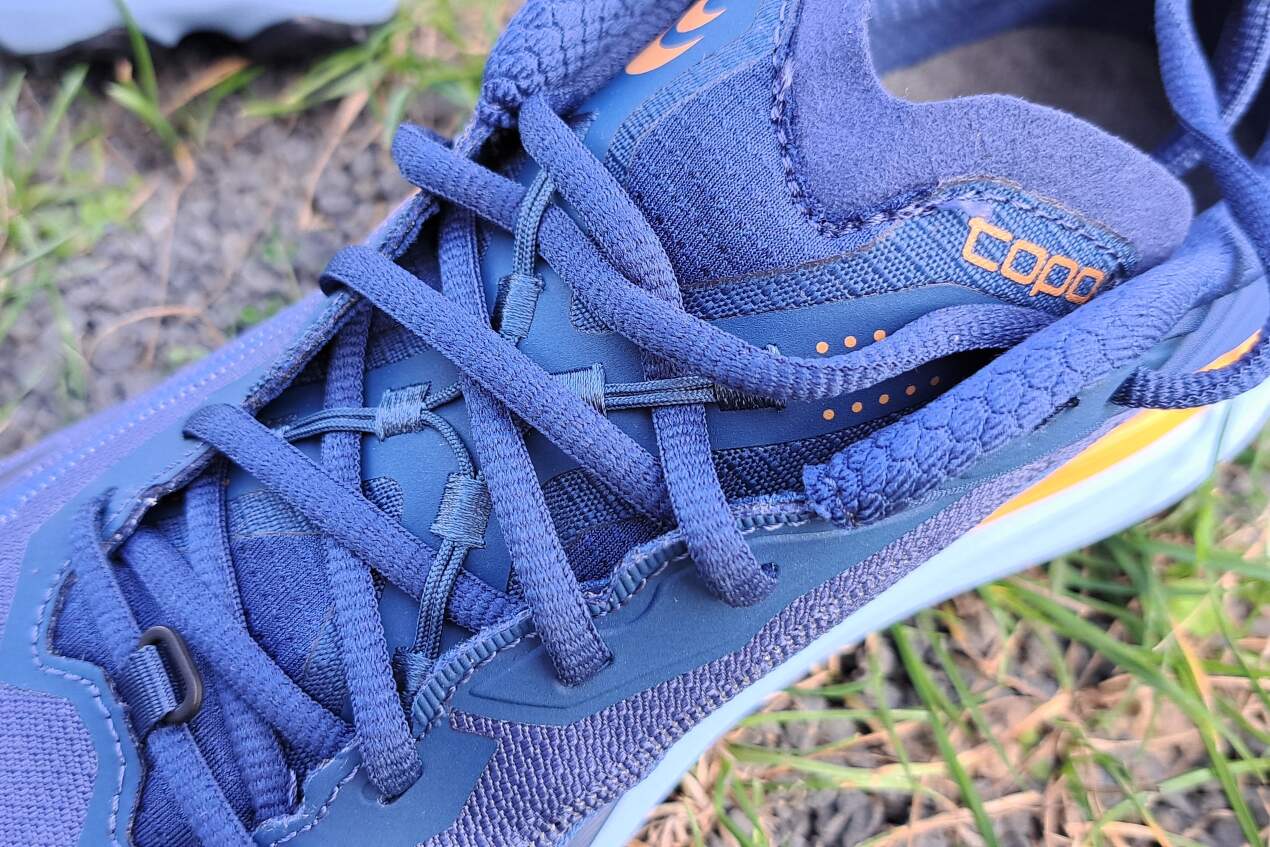 Jak zwykle w przypadku TOPO, cholewka dobrze przylega do stopy w okolicy kostki i podbicia, zapewniając jednocześnie królewską przestrzeń na palce. Płaskie sznurowadła przechodzą przez boki w 5 lub 6 (ostatni otwór jest standardowo podwójny, aby dopasować się do podbicia użytkownika) otworach, jednocześnie mocując język w unikalny sposób. Czuje się nieco mniej amortyzowany niż MTN Racers, ale ma asymetryczne wycięcie w kształcie litery V i cienką krawędź dla jeszcze lepszego dopasowania.