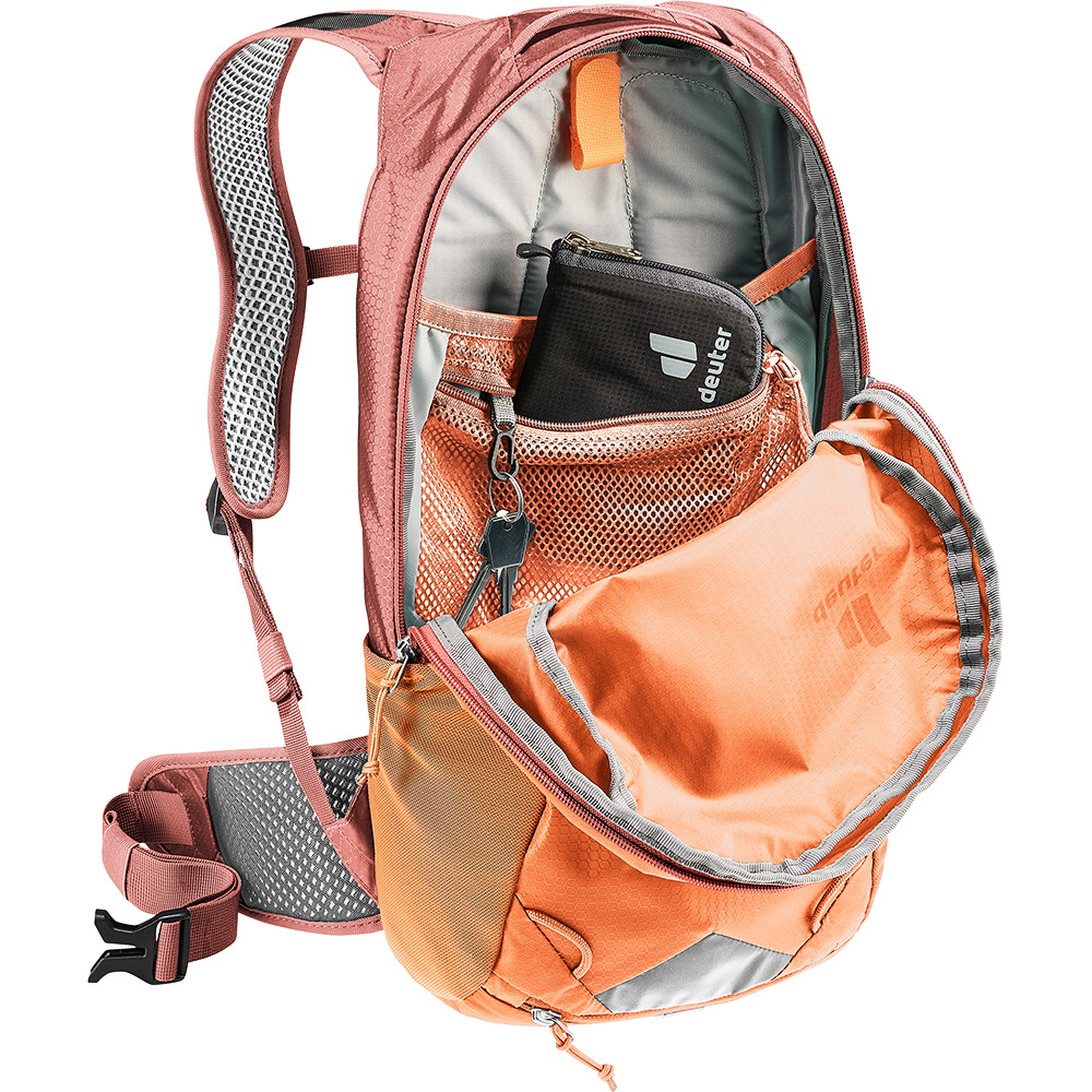 Plecak Race 12 firmy deuter to wytrzymały plecak rowerowy, który zapewnia doskonałą równowagę między wagą a komfortem. Ta średniej wielkości, ale wciąż lekka wersja zmieści wszystko na cały dzień jazdy na rowerze górskim. Można w nim umieścić wiatrówkę i żel energetyczny, telefon komórkowy w bocznej kieszeni, a w głównej kieszeni nawet 2-litrowy bukłak. Z łatwością przymocujesz gogle do paska na ramię, gdy będziesz podjadać lub podziwiać psa kumpla, i przypniesz kask do przedniej części plecaka za pomocą pętli. A jeśli zacznie padać, możesz błyskawicznie wyciągnąć dołączony płaszcz przeciwdeszczowy.