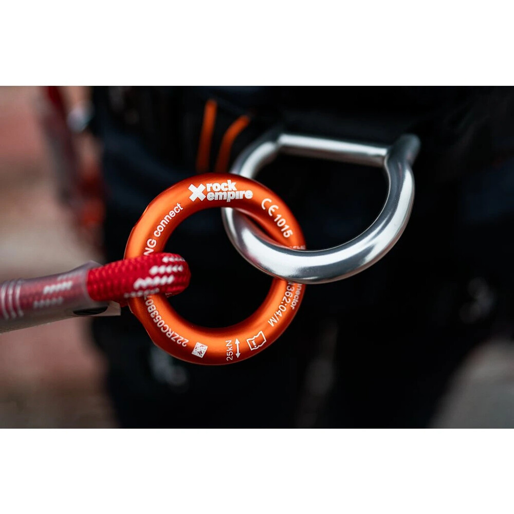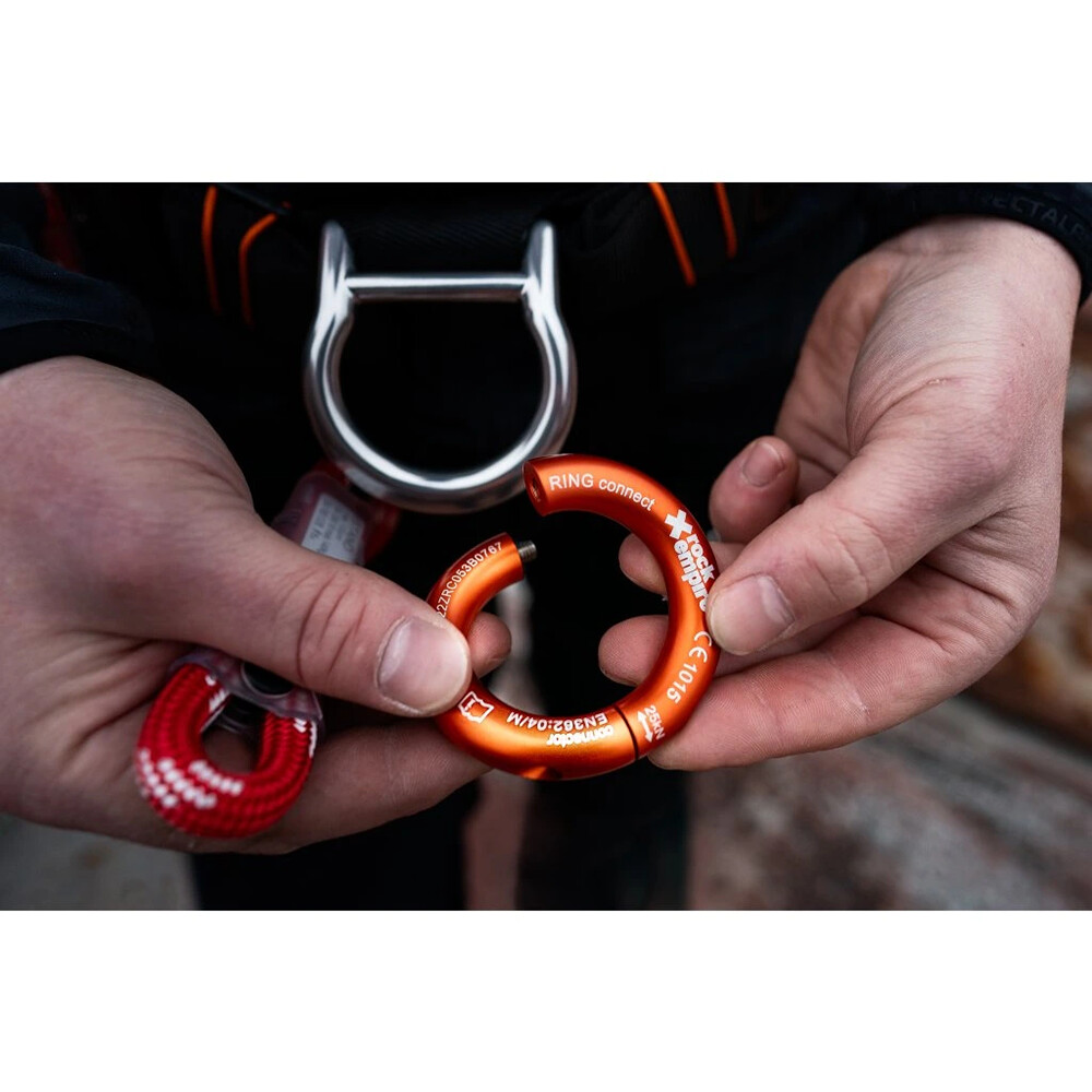 RING Connect to w pełni zdemontowany pierścień AL. Zdemontowane połączenia są zabezpieczone dwiema śrubami ze stali nierdzewnej. Maksymalna wytrzymałość pierścienia (25 kN) jest taka sama na całym obwodzie pierścienia. Dzięki okrągłemu przekrojowi i grubości ścianki 13,5 mm, RING connect nadaje się do bezpośredniego wiązania lin i smyczy bezpośrednio w pierścieniu. Dzięki certyfikacji EN362 może być stosowany wszędzie tam, gdzie konwencjonalne karabinki i maillony nie są odpowiednie.