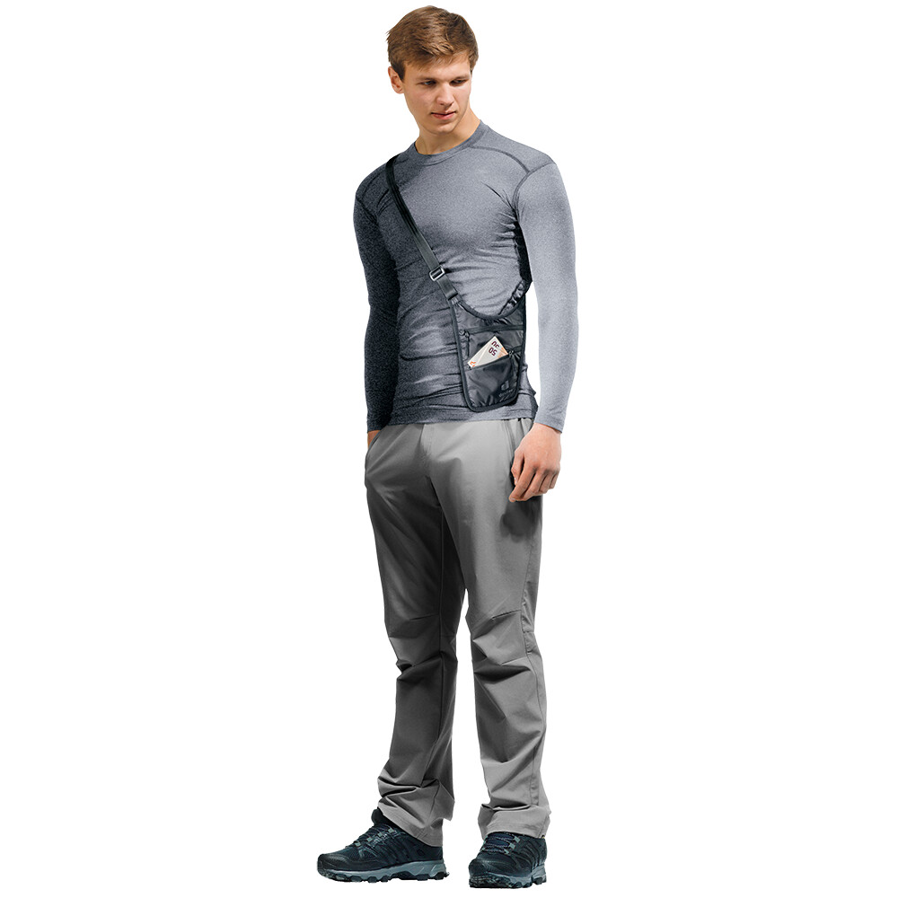 Security Holster firmy deuter to idealny portfel podróżny. Ma płaski profil, jest wykonany z lekkiego materiału i doskonale chowa się pod t-shirtem lub koszulą. Dokumenty, pieniądze, karty kredytowe, bilety lotnicze i inne cenne przedmioty są bezpieczne na ciele i pod ręką. Posiada dwie zapinane na zamek kieszenie i wewnętrzną przegrodę z siatki. Można ją nosić na całym ciele (crossbody) lub jako klasyczną nerkę. Pasek ma regulowaną długość, a także odpinany pas biodrowy. Materiał jest wygodny nawet podczas noszenia na gołej skórze.