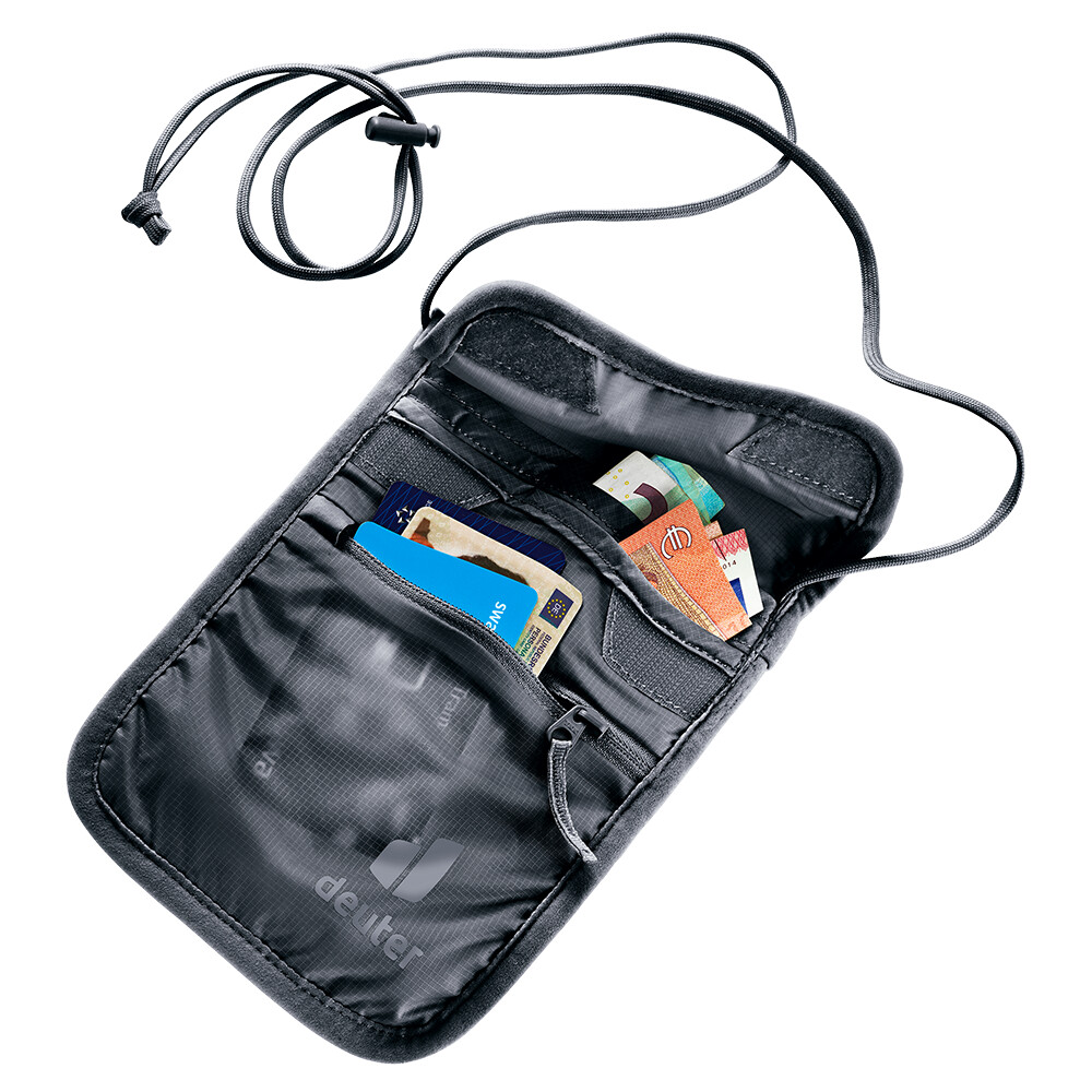 Security Wallet firmy deuter to idealny portfel podróżny. Ma płaski profil, jest wykonany z lekkiego materiału i doskonale chowa się pod koszulką lub koszulą. Dzięki temu dokumenty, pieniądze, karty kredytowe, bilety lotnicze i inne cenne przedmioty są bezpieczne na ciele, a jednocześnie pod ręką. Portfel ma zapięcie na rzep z kieszenią zapinaną na suwak i innymi przegródkami pod spodem. Ma również regulowaną długość sznurka, a materiał jest wygodny nawet podczas noszenia na gołej skórze.