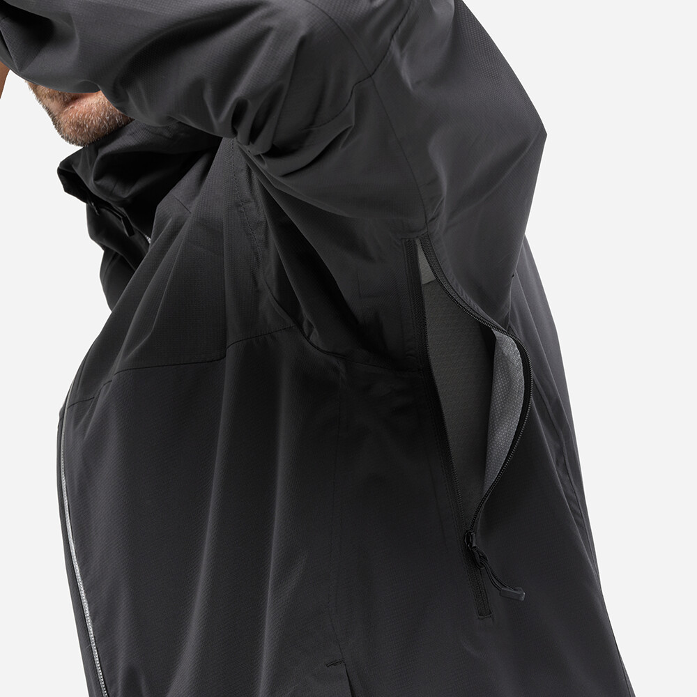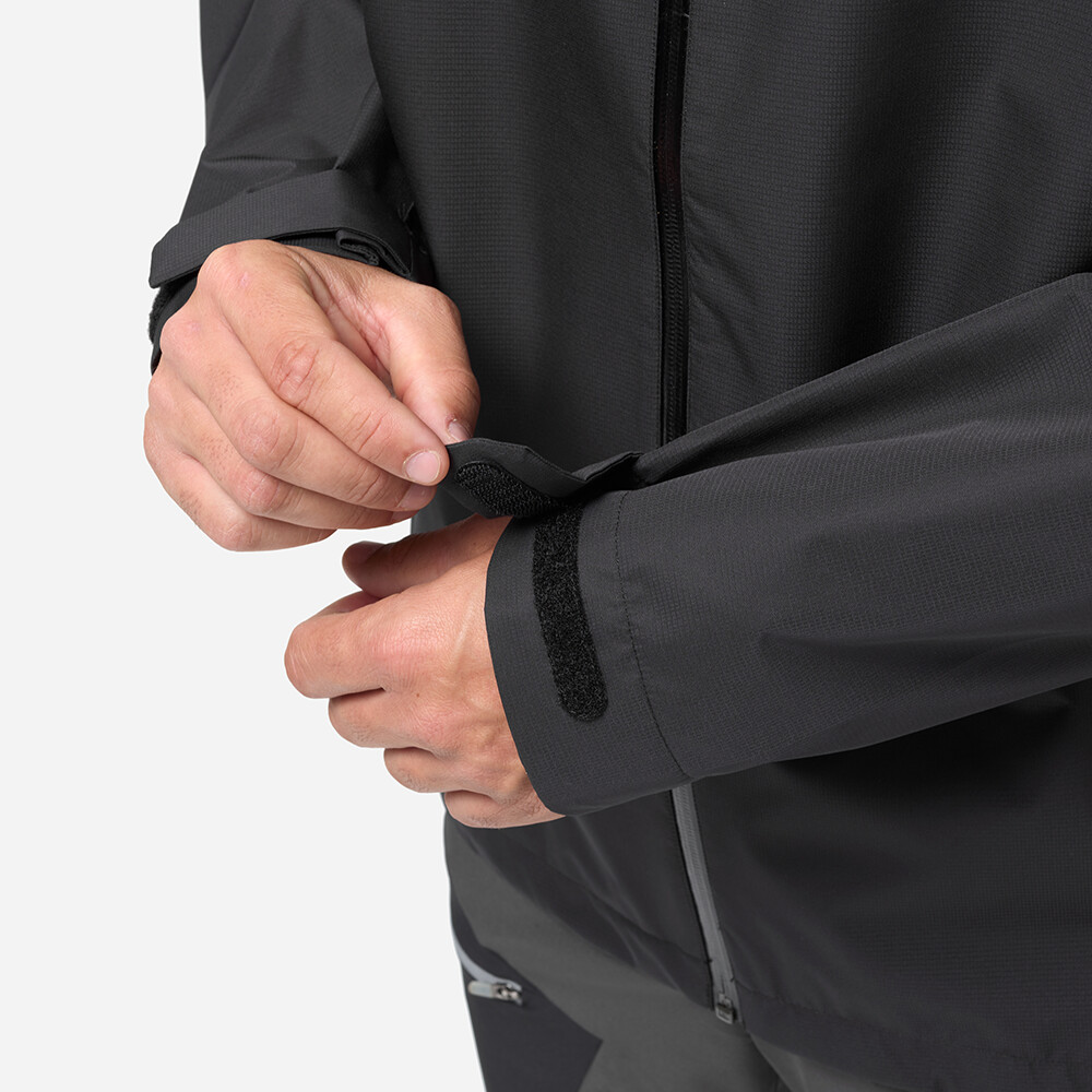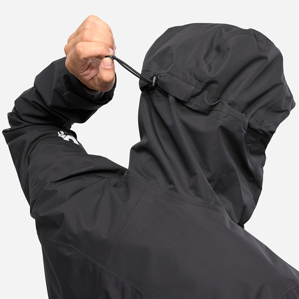 Kurtka jest wykonana z poliestru pochodzącego z recyklingu z wykończeniem ripstop i membraną 10K/10K DRYEDGE™, która zapewnia zarówno odporność na opady, jak i dobre odprowadzanie wilgoci. Dzięki 2,5-warstwowej konstrukcji kurtka zapewnia swobodę ruchów i niską wagę. Zamki wentylacyjne pod pachami umożliwiają regulację temperatury przy większym obciążeniu, a regulowany stały kaptur, kołnierz ochronny i ściągacz zwiększają ochronę przed niepogodą. Dwie zapinane na zamek kieszenie na dłonie pozwalają mieć pod ręką niezbędne drobiazgi podczas każdej wędrówki.