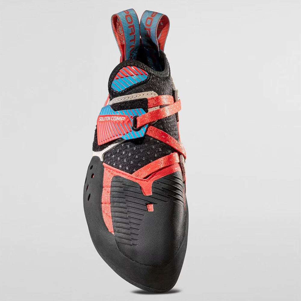 Solution Comp Women to model wspinaczkowy La Sportiva, który został przeprojektowany za namową i we współpracy z liderami wyścigów wspinaczkowych, aby lepiej dopasować się do specyfiki tras wyścigowych na sztucznych ścianach. Pozostawiono przyczepną podeszwę Vibram® XS Grip2 3,5 mm, która doskonale trzyma się na zaokrąglonych i gładszych stopniach. Anatomiczna podeszwa środkowa wykonana jest z materiału Hytrel i gwarantuje dobre wsparcie palców w obszarze śródstopia, zapewniając pełną kontrolę podczas stąpania nawet na małym stopniu. W nowoczesnych szlakach wyścigowych ważne jest, aby podeszwa środkowa i podeszwa zewnętrzna były elastyczne, dzięki czemu wspinacz może zostać nadepnięty, jeśli to konieczne, aby umieścić stopę na tarciu. Ogólną stabilność wspinacza na stopie gwarantuje czteropunktowy system uprzęży, który owija się wokół stopy. W modelu Solution Comp pięta S-Heel została zastąpiona klasyczną, bardziej miękką konstrukcją. Pięta jest bardziej elastyczna, co kładzie większy nacisk na doskonałą technikę haczenia, ale pięta jest bardziej precyzyjna. Z tego powodu buty wspinaczkowe Comp mogą być również ciekawą alternatywą dla klasycznych butów Solution, ponieważ pięta S może nie pasować idealnie do każdego. Wspinacze mają oczywiście wysoki gumowany nosek, który jest wyprofilowany dla lepszej przyczepności.