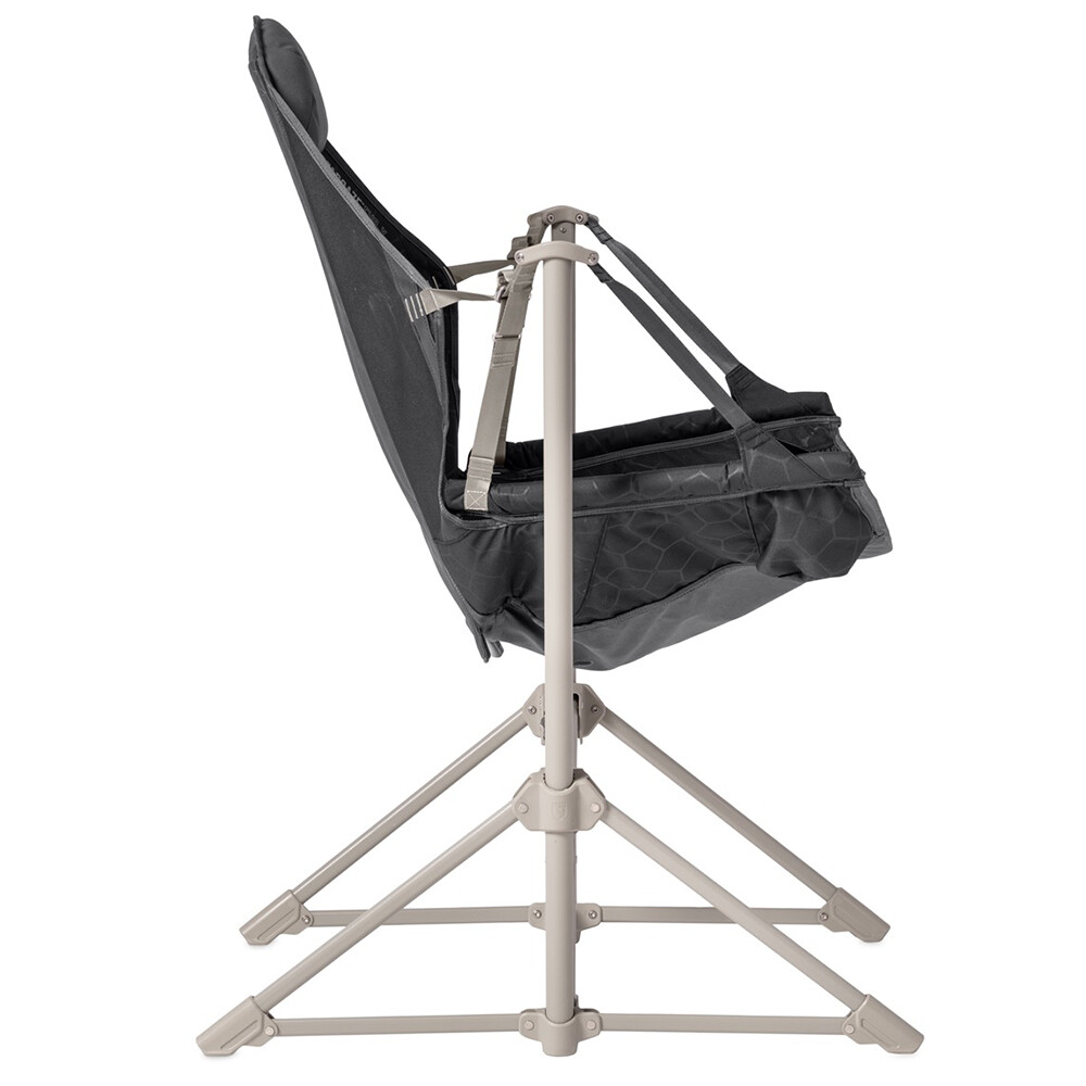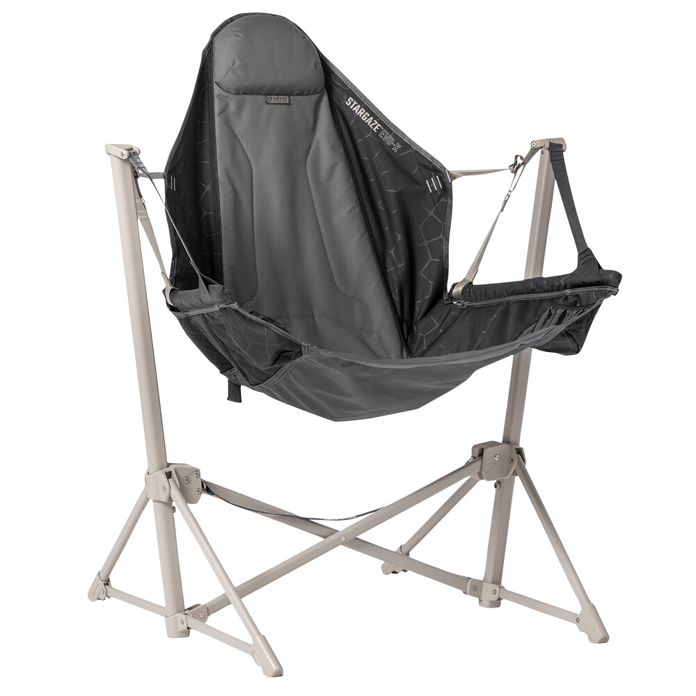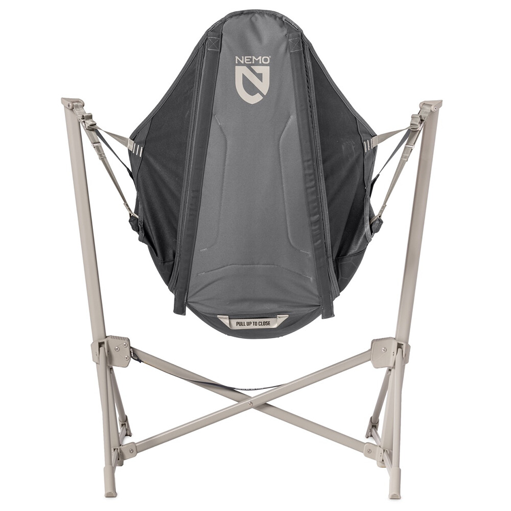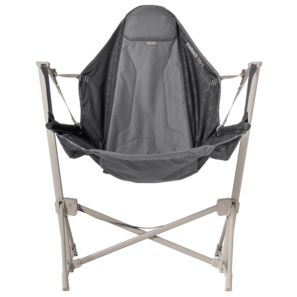 Fotel Stargaze Evo-X od Nemo zapewni Ci wygodne miejsce do siedzenia i przyjemne doznania podczas bujania. Rama wykonana jest z wytrzymałego aluminium lotniczego i wszystko jest gotowe do bardzo prostego, jednoetapowego montażu. Nie potrzebujesz żadnych narzędzi i nie ma potrzeby skomplikowanej regulacji poszczególnych części. Jednocześnie krzesło Stargaze Evo-X zachowuje pełną regulację (regulacja pochylenia oparcia, podparcia łokci i zagłówka z regulacją wysokości). Po bokach znajdują się kieszenie na napój, telefon komórkowy lub czołówkę. Dzięki sześciu punktom podparcia jest bardzo stabilny na różnych rodzajach powierzchni (piasek, teren skalisty, miękkie podłoże). Fotel posiada certyfikat Bluesign®. Ciesz się płynnym ruchem bujania, jak w hamaku.