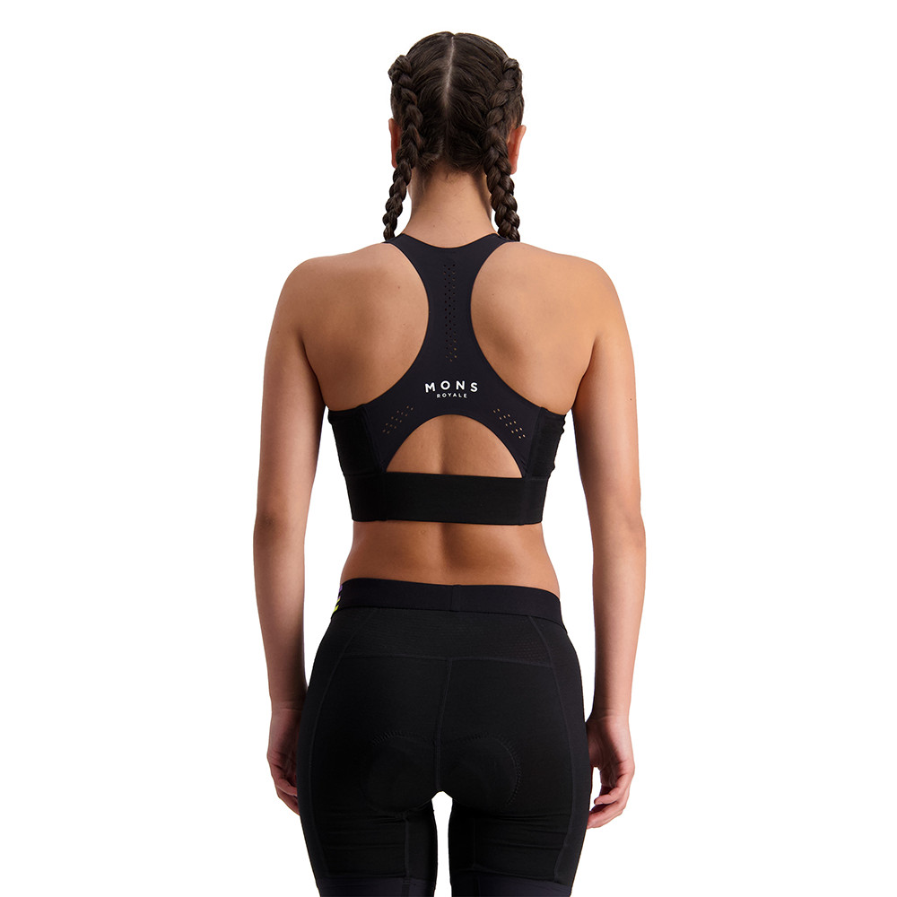 Wąski krój biustonosza sportowego Stratos Sports Bra Women od Mons Royale nadaje się do niemal każdej aktywności, najlepiej dzikiej jazdy na rowerze lub treningu, w którym potrzebujesz średniego wsparcia piersi. Trójwarstwowy przód z merynosów z wyjmowaną wyściółką dba o wsparcie i komfort termiczny, a laserowo cięty nylonowy tył zapewnia wsparcie pleców i dobre wysychanie. Głęboki pas pod klatką piersiową utrzymuje wszystko na swoim miejscu. Luźny krój zapewnia radość z ruchu.