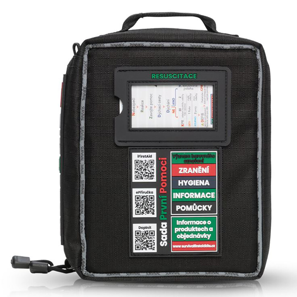 - Informacje - kolor zielony (instrukcje i zapisy): 1× karta CPR z procedurą resuscytacji, 1× książeczka pierwszej pomocy, miejsce na osobiste leki lub inne drobne przedmioty, notatnik z ołówkiem (zawarty w książeczce), BEZPŁATNY dostęp do aplikacji iFirstAid na telefon komórkowy.