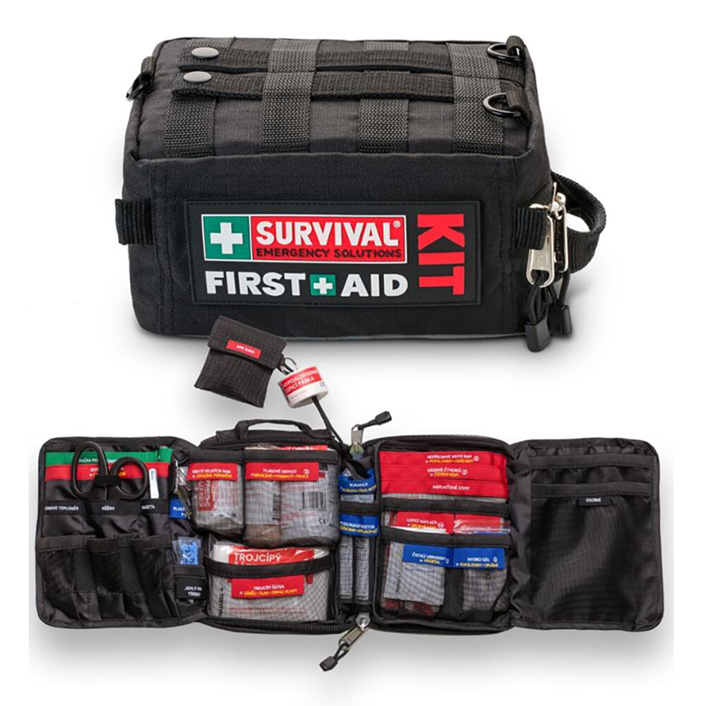 - Trauma - Red (leczenie ran): 50× sterylne plastry samoprzylepne (pakowane pojedynczo), 2× sterylne gaziki do oczyszczania ran (3 w opakowaniu, 7,5 × 7,5 cm), 1× folia izotermiczna (2,1 × 1,6 m), 2× sterylne płatki pod oczy, 3× nieprzylepne osłony na rany (5 × 5 cm), 1× nieprzylepna osłona na ranę (7,5 × 10 cm), 1× sterylna osłona na ranę no. 14 (średni), 1 × SMART Bandage™ - inteligentny bandaż uciskowy (10 cm × 2 m), 1 × średni bandaż uciskowy (10 cm × 1,8 m), 1 × bandaż trójpasmowy (96 × 96 × 136 cm), 1 × zestaw plastrów (3 sztuki w opakowaniu).