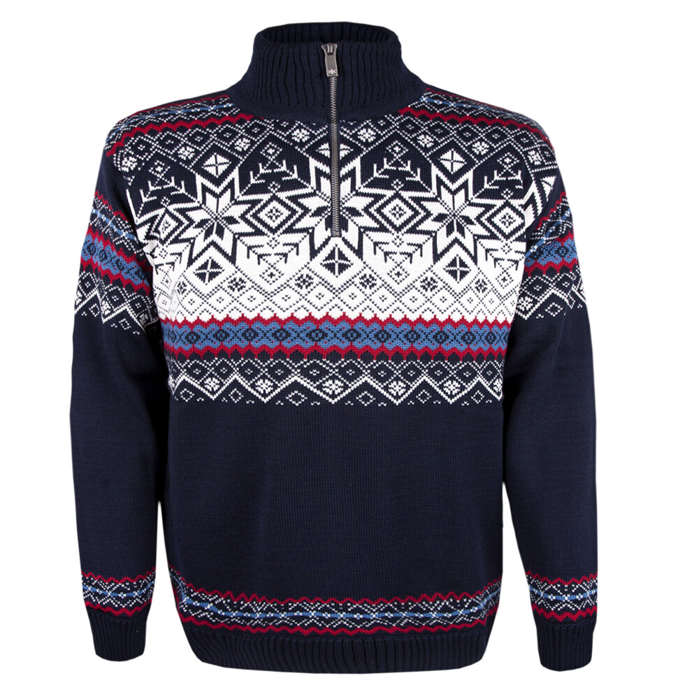 Sweter z wełny merynosów łączący tradycyjny norweski wzór z nowoczesnym krojem i praktyczną stójką zapinaną na zamek. Nadaje się na wycieczki, ale także do noszenia na co dzień.