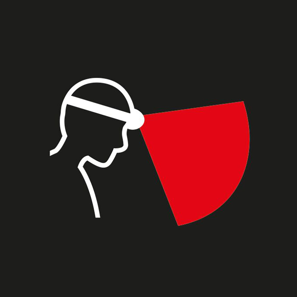 - Latarka czołowa może być odchylona w górę, gdy jest noszona na szyi, aby zapewnić lepszą widoczność do przodu, lub w dół, gdy jest noszona na kasku