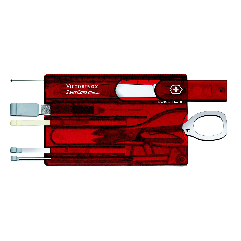 Narzędzie wielofunkcyjne oferuje imponujące dziesięć funkcji w czerwonym etui wielkości karty kredytowej.