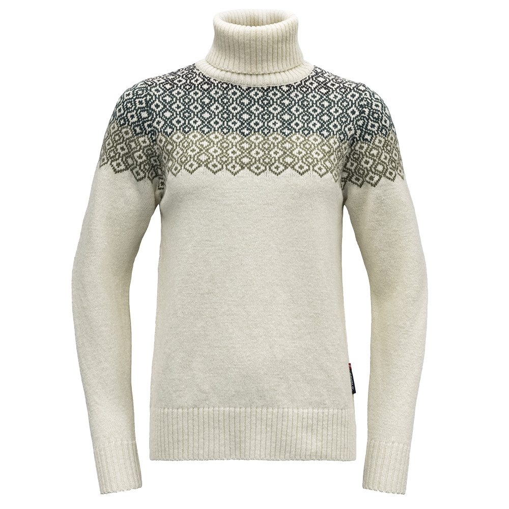 Damski elegancki sweter z golfem Syvde Wool High Neck norweskiej marki Devold. Wykonany jest w 100% z bardzo cienkiej i miękkiej wełny z subtelnymi wzorami. Idealna ciepła warstwa pod wodoodporną lub ocieplaną kurtkę. W swetrze Syvde będziesz błyszczeć w górach i w mieście.