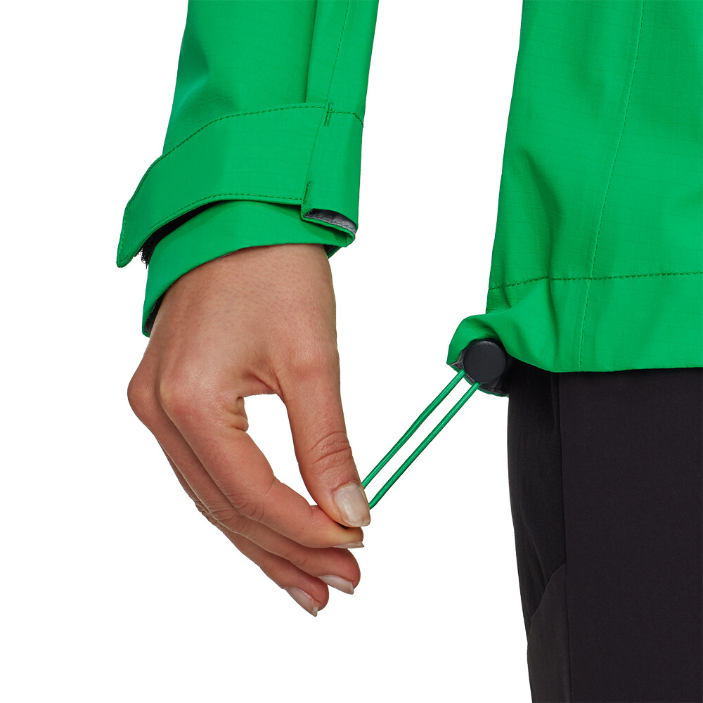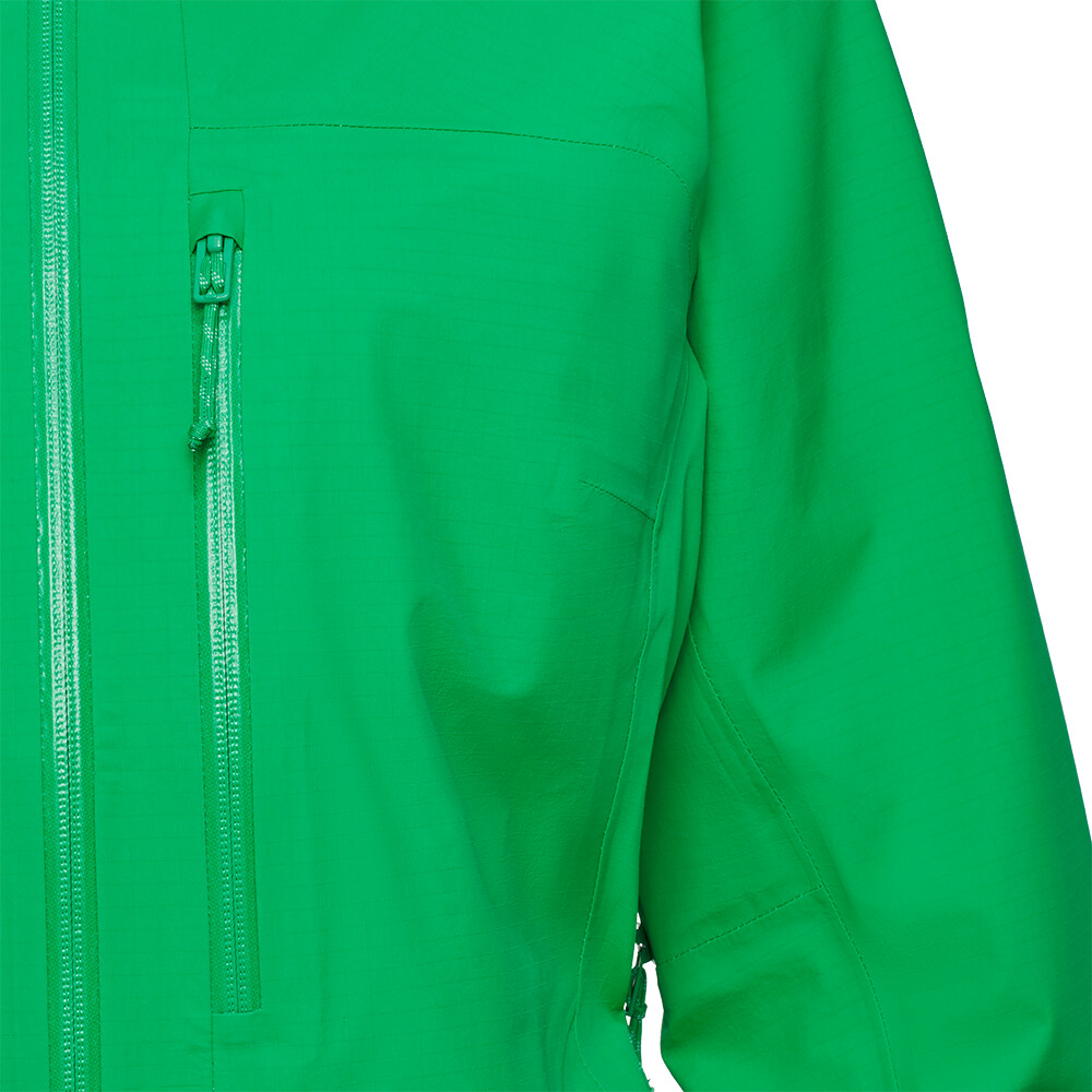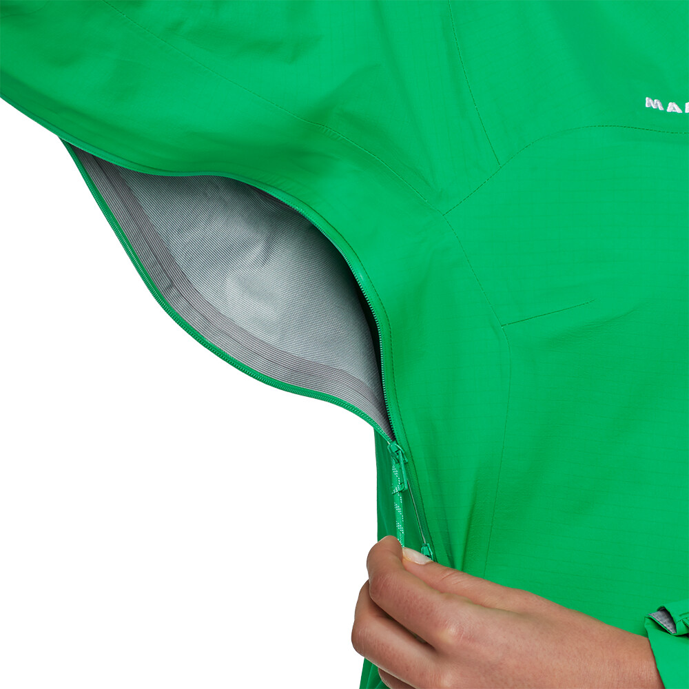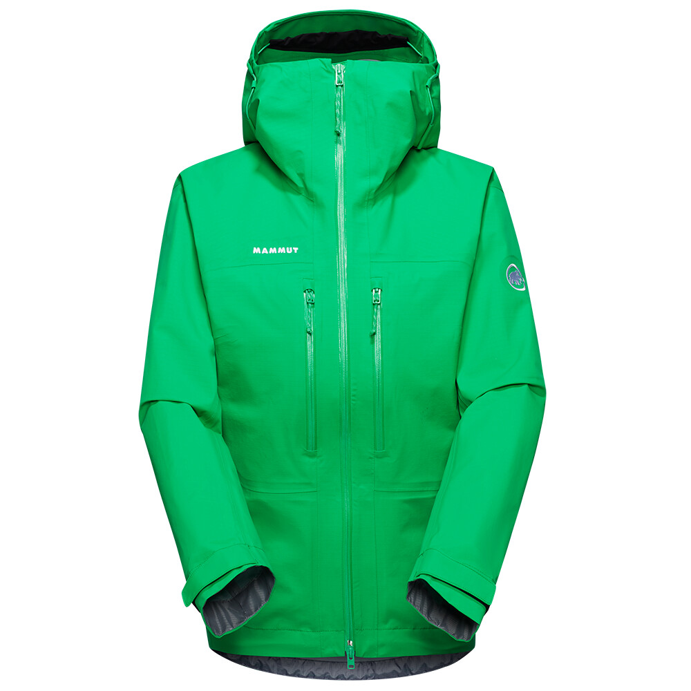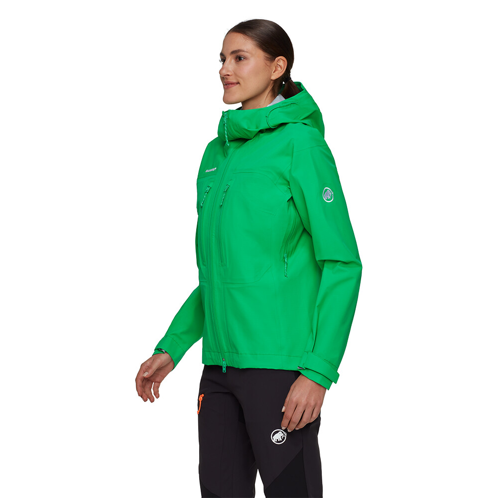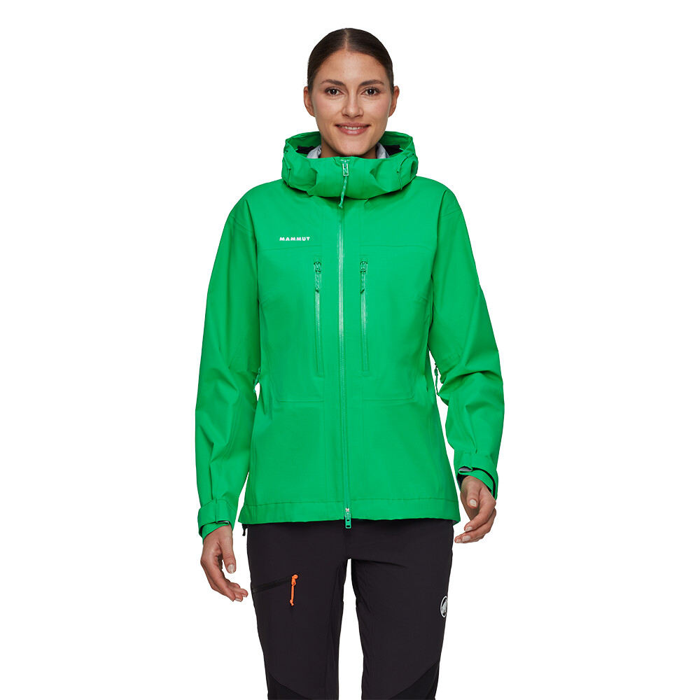 Kurtka została wykonana z materiału Mammut DRY Expedition, który jest niezwykle oddychający, wodoodporny i wiatroszczelny. Tkanina ripstop zapewnia wyjątkową trwałość. Sportowy damski krój zapewnia swobodę ruchów. Regulowany kaptur jest kompatybilny z kaskiem. Dwie zapinane na zamek kieszenie są łatwo dostępne, nawet gdy masz założoną uprząż wspinaczkową lub zapięty pas biodrowy. Małe przedmioty można przechowywać w wewnętrznej kieszeni na suwak. Zapinana na zamek wentylacja pod pachami umożliwia regulację temperatury. Rękawy mają regulowane mankiety, które można obsługiwać nawet w rękawiczkach. Dolny dół jest również regulowany.