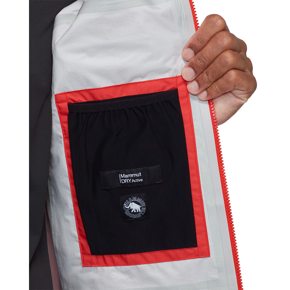 Kurtka wykonana jest z ultralekkiego 3-warstwowego laminatu Mammut DRY Active. Jak sama nazwa wskazuje, jest to ekskluzywna membrana szwajcarskiego producenta Mammut, która jest ukierunkowana na aktywny ruch i maksymalizuje jego oddychalność. Nie musisz się martwić, że ta kurtka będzie w jakiś sposób znacząco pozbawiona wentylacji pod pachami. Lekka rozciągliwość materiału jest uzupełniona technicznym dopasowaniem Mammut High Reach Technology ™, które jest znakiem rozpoznawczym wieloletniego doświadczenia Mammut w alpinizmie. Ergonomiczny kaptur jest dobrze dopasowany i nie ogranicza pola widzenia. Jest w pełni symetryczny i regulowany jednym pociągnięciem, a pod nim można z łatwością założyć kask. Końce rękawów są wstępnie ukształtowane i częściowo elastyczne. Dolny dół jest regulowany za pomocą sznurka. Dwie kieszenie na piersi są idealne do przechowywania pasów narciarskich lub rękawic. Wewnętrzna kieszeń z siatki służy również do pakowania kurtki.