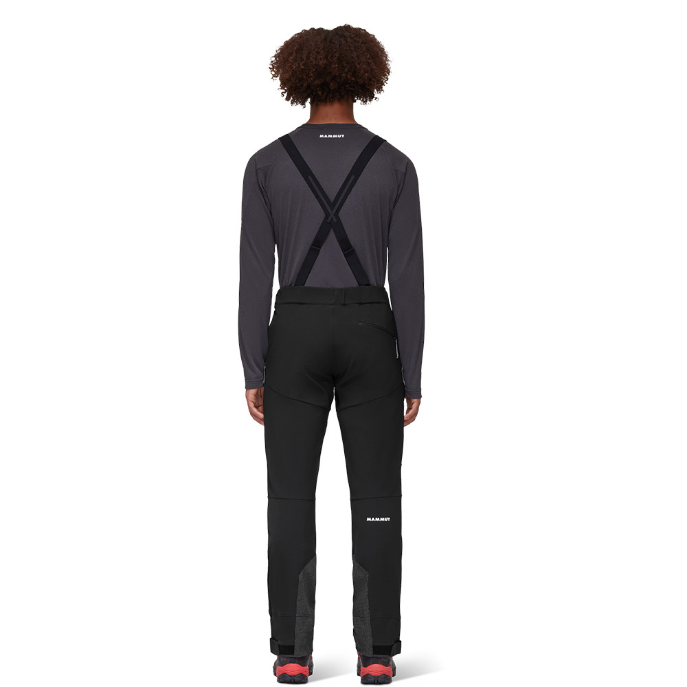 Szczotkowany softshell o podwójnym splocie jest ciepły i wiatroszczelny, ale zapewnia również doskonałe odprowadzanie wilgoci. Boczny zamek błyskawiczny umożliwia regulację temperatury. Wstępnie ukształtowane kolana zapewniają swobodę ruchów. Zapinane na zamek kieszenie są doskonale dostępne nawet podczas noszenia siodełka wspinaczkowego. Wzmocnione od wewnątrz nogawki są odporne na krawędzie nart i raki. Mankiety przeciwśnieżne można przymocować do butów turystycznych dzięki haczykowi.