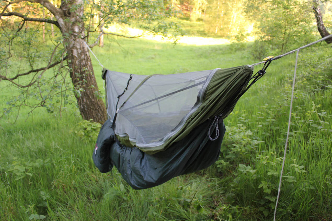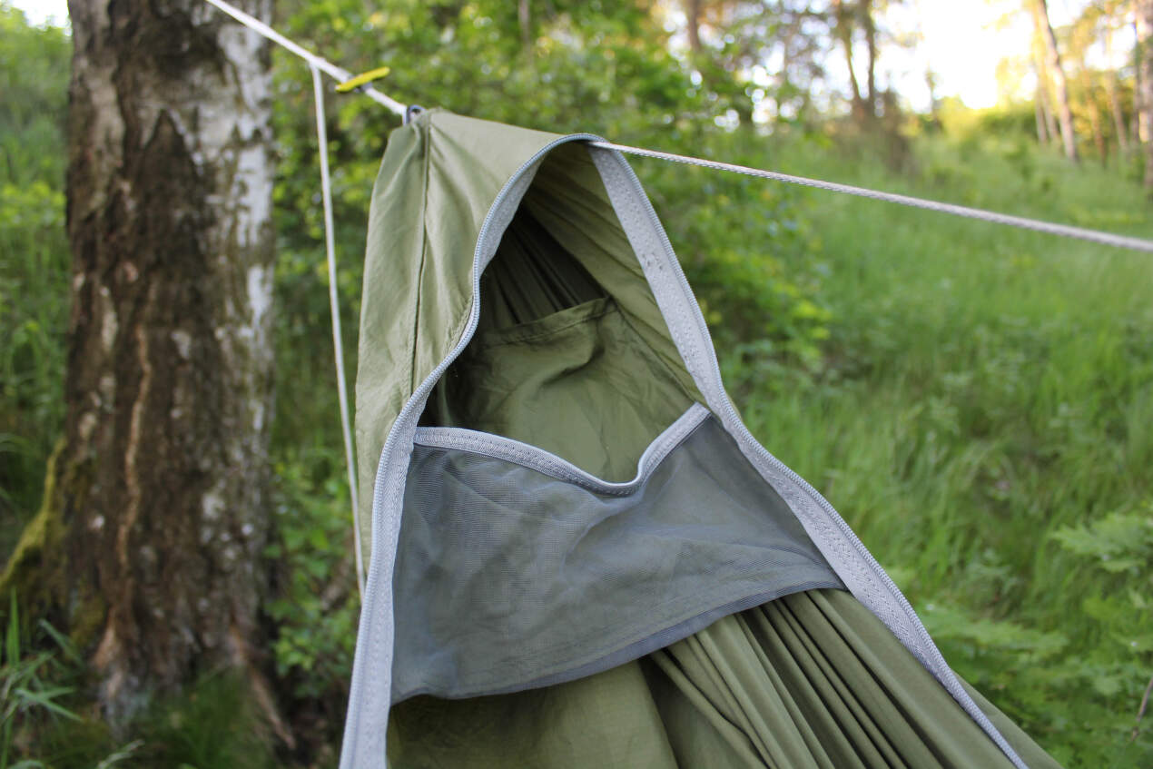 Moskitiera jest wyposażona w zamek błyskawiczny dookoła z dwoma przeciwległymi suwakami. Są one wyposażone w odblaskowe zaczepy. Samą moskitierę można odpiąć/używać tylko z hamaka, ale nie można jej całkowicie od niego oddzielić. Jest ona mocno przyszyta do hamaka na jednym końcu i można ją schować do wspomnianej wyżej torby. Niektórzy uważają to za wadę tego hamaka, ale nie ja. Z moskitiery korzystam przez cały rok. W cieplejszych miesiącach jej zaleta jest chyba oczywista. W miesiącach zimowych z jednej strony nie chcę tracić zalet szczeliny i królewskiej przestrzeni, którą zapewnia (przy złożonej moskitierze tracimy szczelinę, tylko grzbiet pozostaje na swoim miejscu), a z drugiej sama moskitiera może już zauważalnie wpływać na szybkość ucieczki ciepła. Zasadniczo mamy więc moskitierę zamontowaną na stałe.