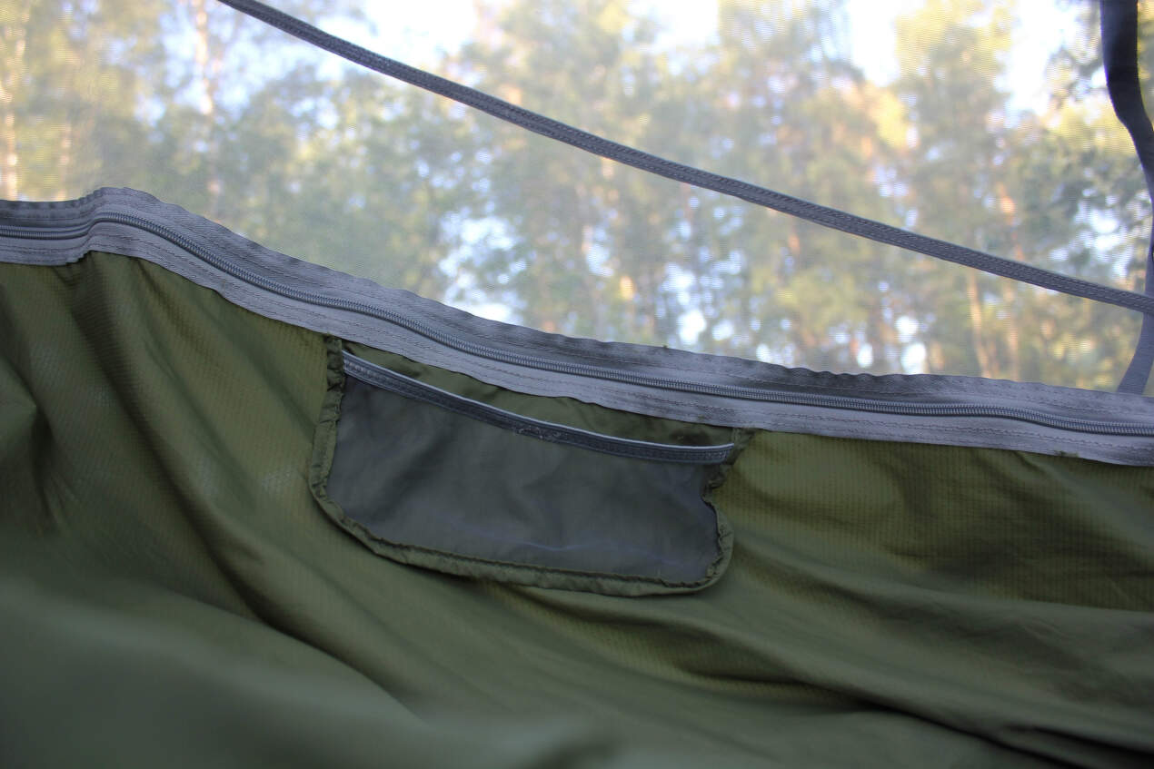 Dla mnie przestrzeń wewnętrzna JungleNest to luksusowa sofa w najbardziej luksusowym apartamencie pięciogwiazdkowego hotelu. Nad głową, na szczycie hamaka, mam pojemną kieszeń na niezbędne drobiazgi. Druga kieszeń znajduje się obok mojej lewej ręki. Wewnętrzna linia grzbietu pozwala mi zawiesić i przewietrzyć kieszenie używanych skarpet lub odłożyć, powiedzmy, latarkę czołową.