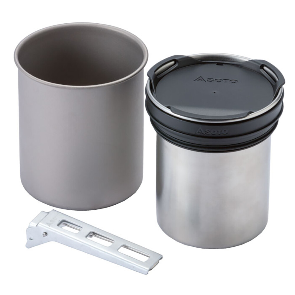 Jeśli potrzebujesz lekkich i niezawodnych naczyń do gotowania w podróży, wybierz Thermostack od SOTO. Inteligentny zestaw do gotowania lub parzenia kawy czy herbaty zawiera dwa kubki o pojemności 350 i 400 ml. Mniejszy wykonany jest ze stali nierdzewnej , a większy z lekkiego stopu tytanu. Pięknie do siebie pasują, więc jeśli nie masz z kim podzielić się kawą, możesz użyć dołączonej silikonowej uszczelki, aby stworzyć z obu kubków kubek o podwójnych ściankach. Przygotowany napój nie poparzy dłoni i dłużej pozostanie gorący. Kubki można zamknąć za pomocą silikonowych pokrywek dołączonych do zestawu. Gorące kubki można przenosić za pomocą dołączonych szczypiec. Jeśli napój wymaga podgrzania, wystarczy wyjąć wewnętrzny kubek i umieścić go na kuchence.