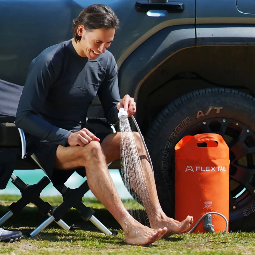 Prysznic kempingowy ze zbiornikiem na wodę Flextail zapewnia maksymalny komfort podczas podróży i biwakowania. Posiada wbudowaną pompę z możliwością ładowania, która pozwala cieszyć się nawet 70 minutami bieżącej wody za naciśnięciem jednego przycisku. Zawiera również zbiornik na wodę o pojemności 20 l. Prysznic może być wiszący lub wolnostojący i ma dwa różne mocowania, klasyczną różę prysznicową lub kran. Dzięki Tiny Shower Bucket możesz z łatwością umyć rower, deskę do paddleboardingu, zadbać o higienę osobistą lub umyć swojego zwierzaka. Można go również używać do mycia naczyń lub napełniania butelek z wodą.