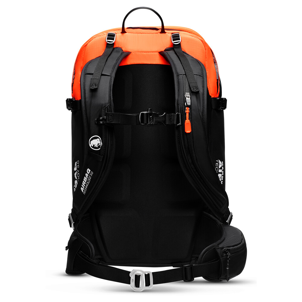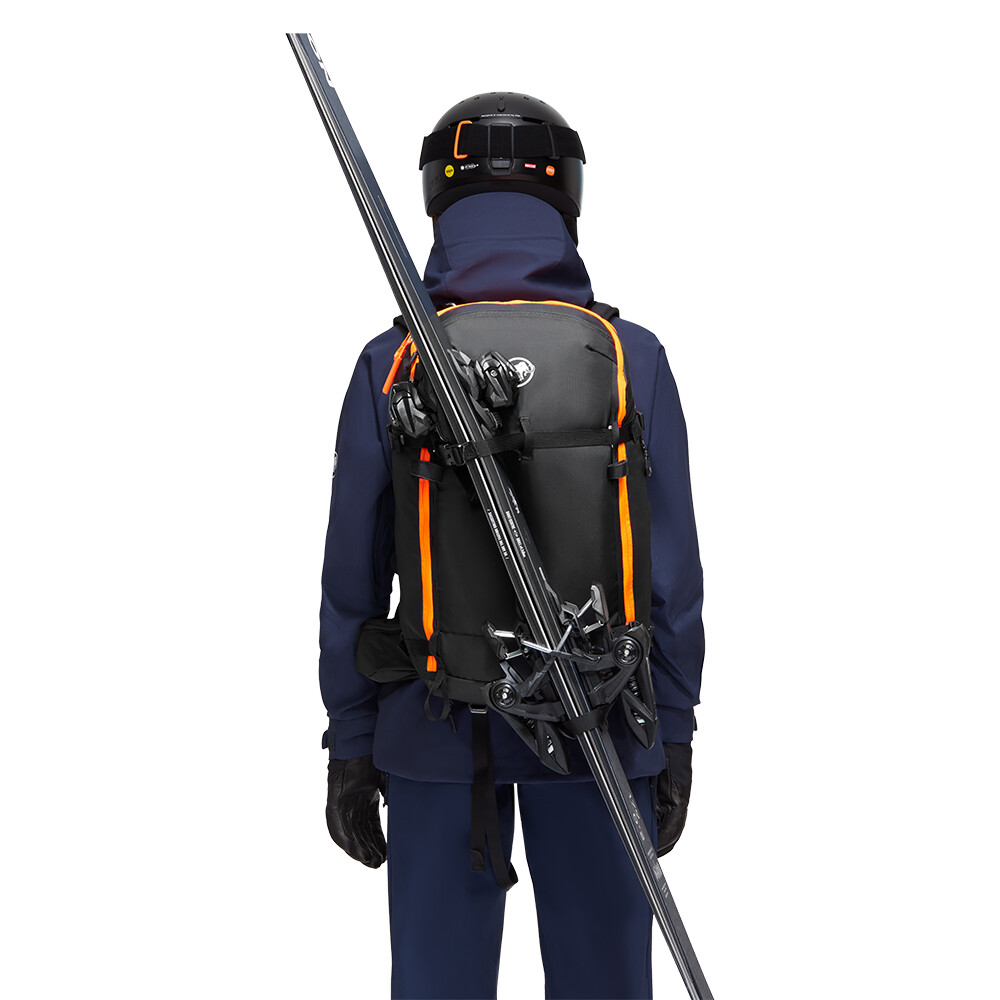 Plecak lawinowy z poduszką powietrzną. Jest lekki i ma wygodny system pleców wykonany z termoformowanej pianki EVA. Możliwość przypięcia nart, snowboardu, kasku, czekana i innego sprzętu. Pomarańczowe elementy dla lepszej widoczności.