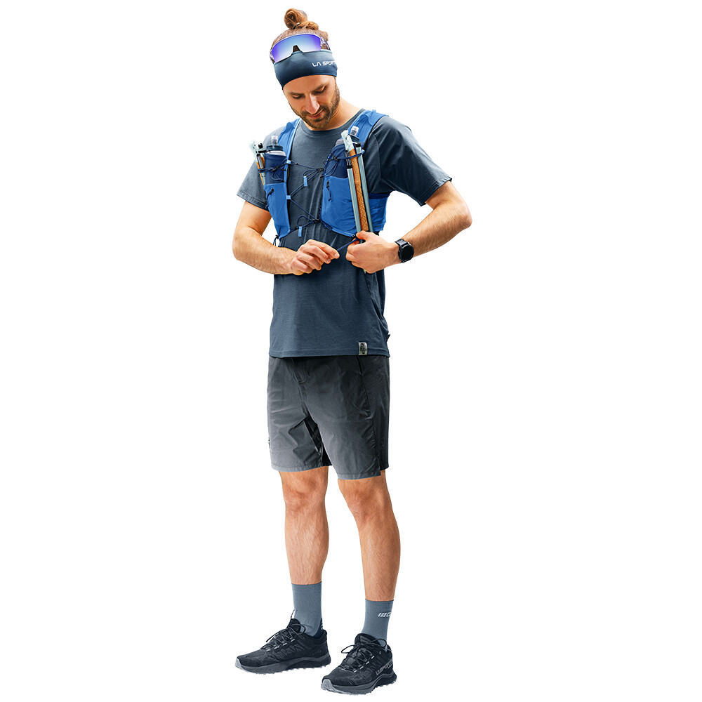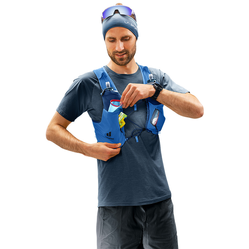 Plecak lub kamizelka do biegania Traick 9 firmy deuter pomaga zabrać ze sobą wszystko, czego potrzebujesz, aby pokonać wybrany szlak. Posiada dwie przednie kieszenie na butelki, otwarte kieszenie i zapinane na zamek kieszenie na ramionach do przechowywania żeli energetycznych i batonów. Ciekawą funkcją jest oddzielna kieszeń na bukłak i zapinana na zamek kieszeń na kurtkę, którą można wyjąć bez konieczności zdejmowania plecaka z pleców. Do plecaka można również przymocować kijki do biegania lub wędrówek. Z przodu kamizelka ma regulowany elastyczny pas piersiowy, który zapewnia idealne dopasowanie podczas stromych podjazdów i szybkich biegów.