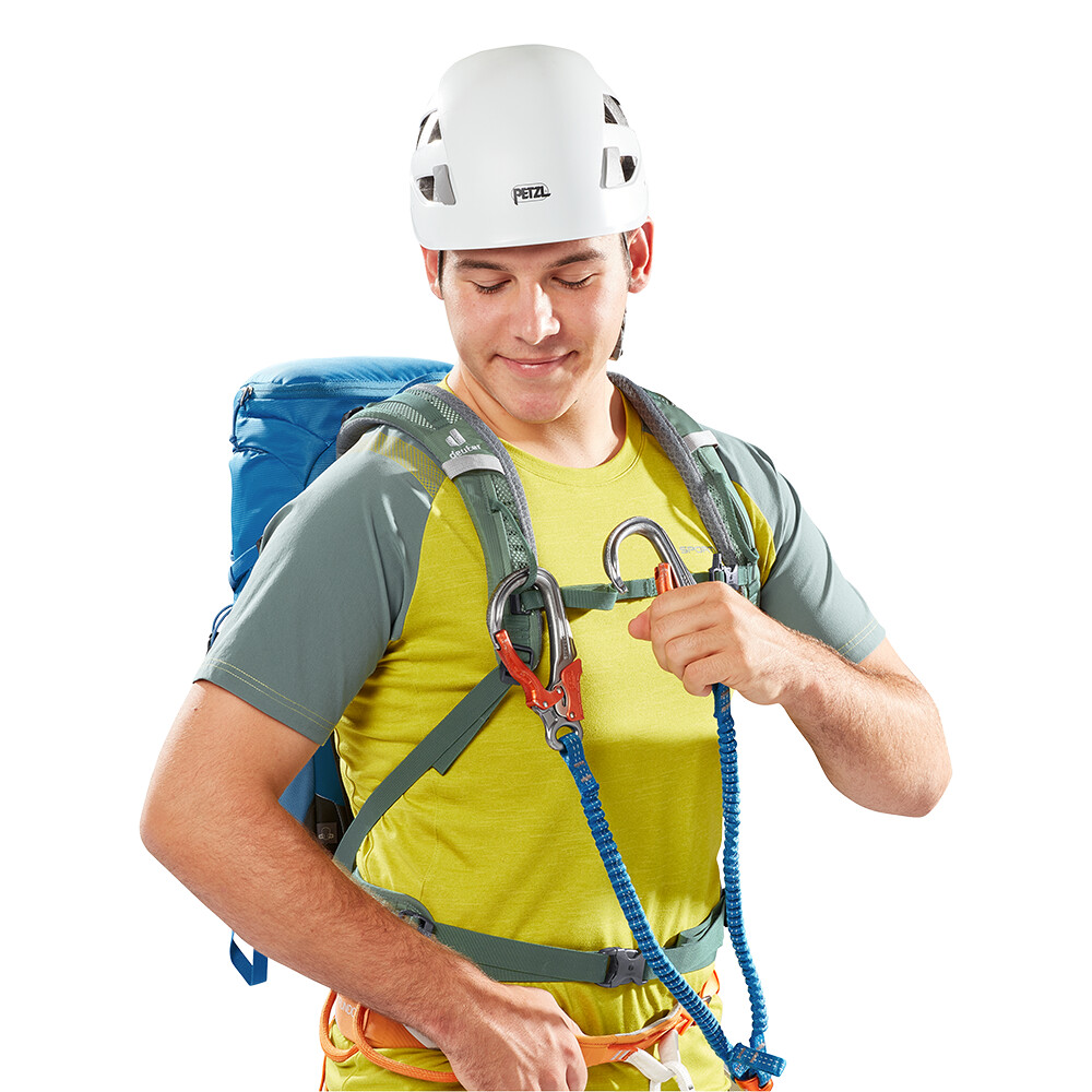 - ręczne pętle karabinkowe do wspinaczki via ferrata przymocowane do pasków naramiennych
