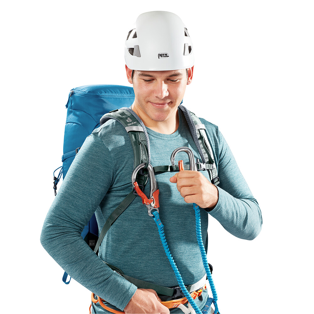 - pętle na karabinki do wspinaczki via ferrata przymocowane do pasków naramiennych