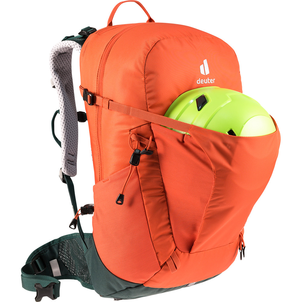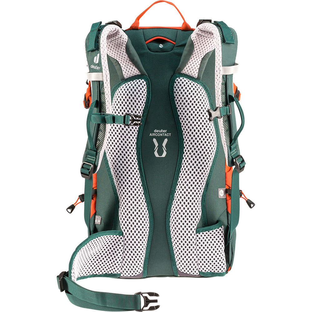 Trail 24 SL to plecak Deutera, który ucieszy wszystkich entuzjastów ferrat. Na pasku naramiennym znajdują się oczka, w które można wpiąć karabinki podczas przejść i wygodnie je odpiąć przed rozpoczęciem wspinaczki. Usztywnienie pleców, wykonane z lekkiego, ale wytrzymałego Derlinu, pomaga rozłożyć ciężar i usztywnić plecy. Zintegrowane paski kompresyjne są mile widzianą funkcją komfortu, wystarczy pociągnąć za uchwyty po bokach, a plecak się schowa. Pas piersiowy i biodrowy to oczywistość. Przednia elastyczna kieszeń z paskami kompresyjnymi służy do przenoszenia kurtki lub kasku. Plecak Trail 24 SL jest odpowiedni dla kobiet lub mniejszych sylwetek.
