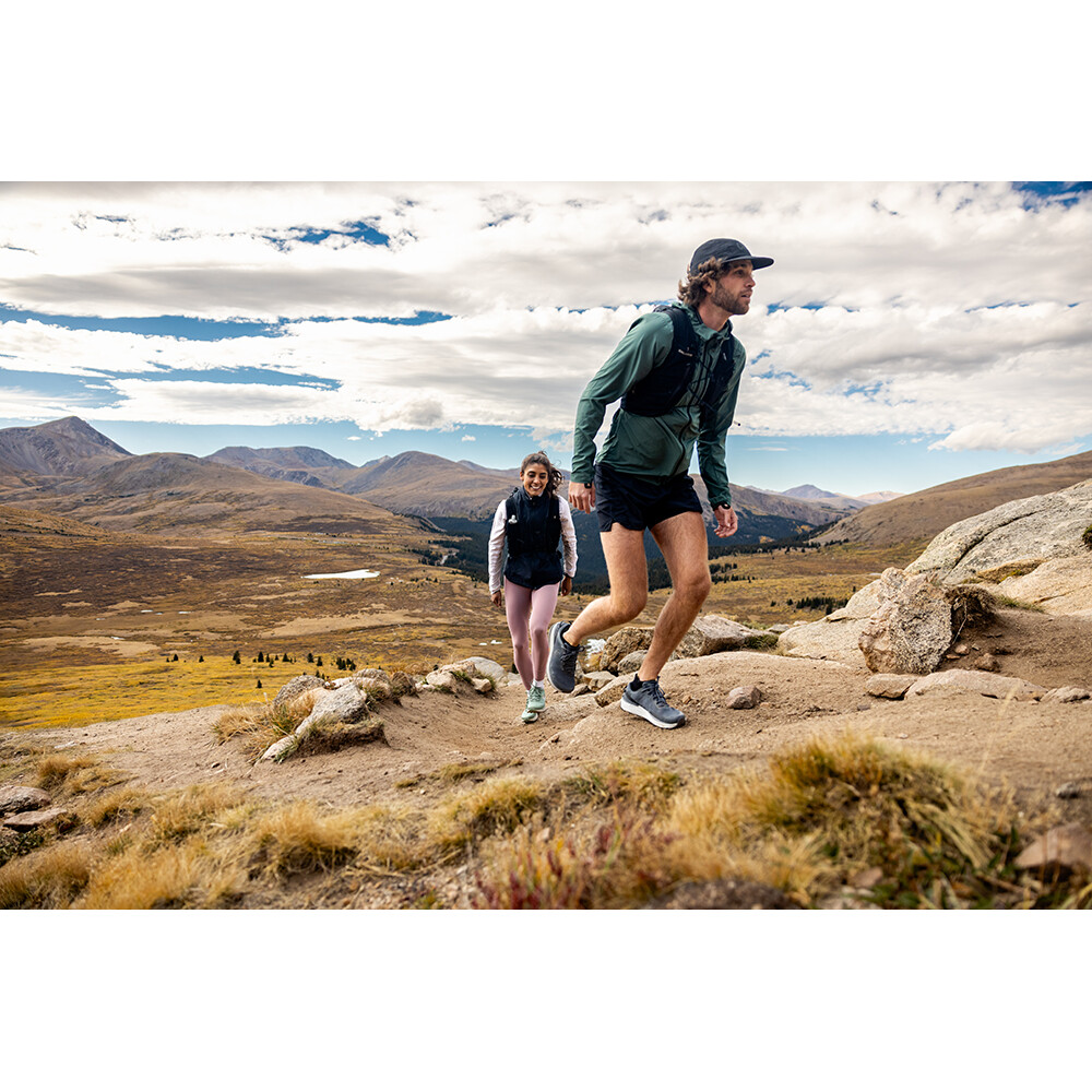 Męskie buty trailowe ze wzmocnioną podeszwą środkową z pianki z pamięcią kształtu i 5-milimetrowym spadkiem (dla śródstopia). Dzięki szerokiemu noskowi i ergonomicznemu dopasowaniu dają poczucie swobody podczas biegania na długich dystansach.