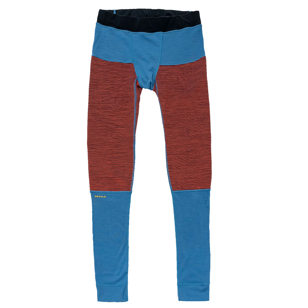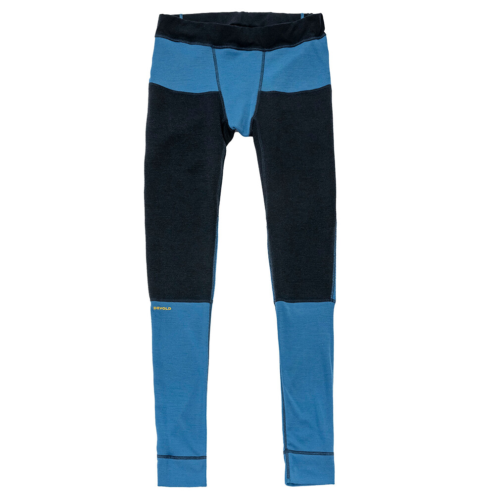 Męskie legginsy merino Tuvegga Merino Longs norweskiej marki Devold, które powstały z połączenia trzech różnych dzianin. Odwracalna konstrukcja jest stosowana na zimnych częściach ciała w udach i pośladkach.