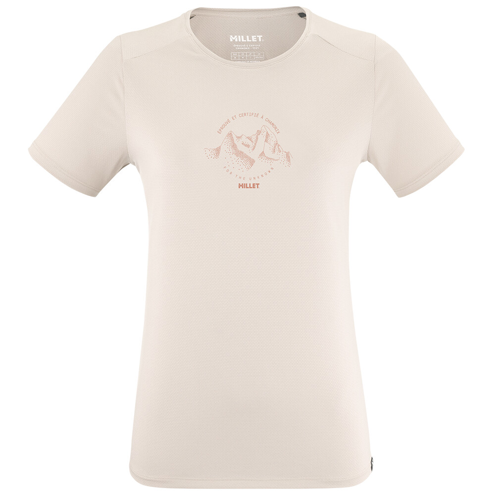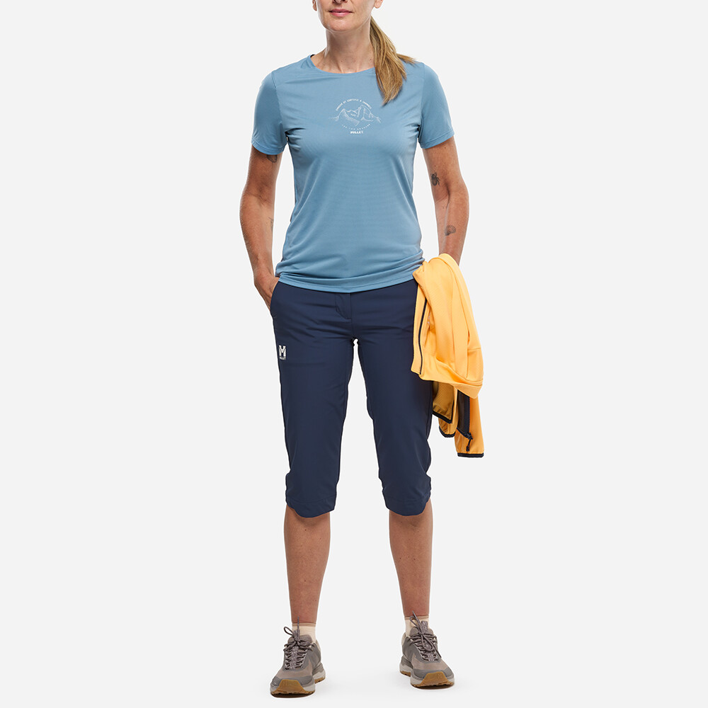 Lekki, strukturalny materiał wykonany w 100% z poliestru skutecznie odprowadza wilgoć i szybko schnie, dzięki czemu pozostaje suchy nawet podczas ciężkiej pracy przez cały dzień. Wygodny, kobiecy krój z okrągłym dekoltem dobrze leży podczas ruchu i odpoczynku. Subtelny motyw górski na środku klatki piersiowej przypomina o alpejskich korzeniach i know-how Millet.